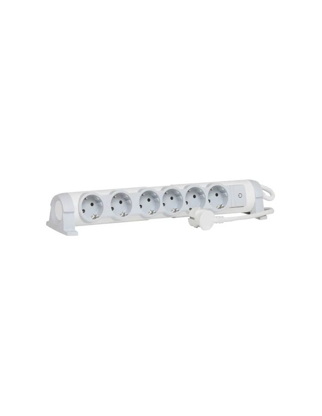 Socle Multiple avec 6 Prises 2P+T, 1,5M de câble 3X1,5mm2 de série Legrand Confort blanc et gris, ce modèle Multiprise comprend un interrupteur lumineux et des supports aux extrémités qui permettent de fixer le socle à l'aide de vis.