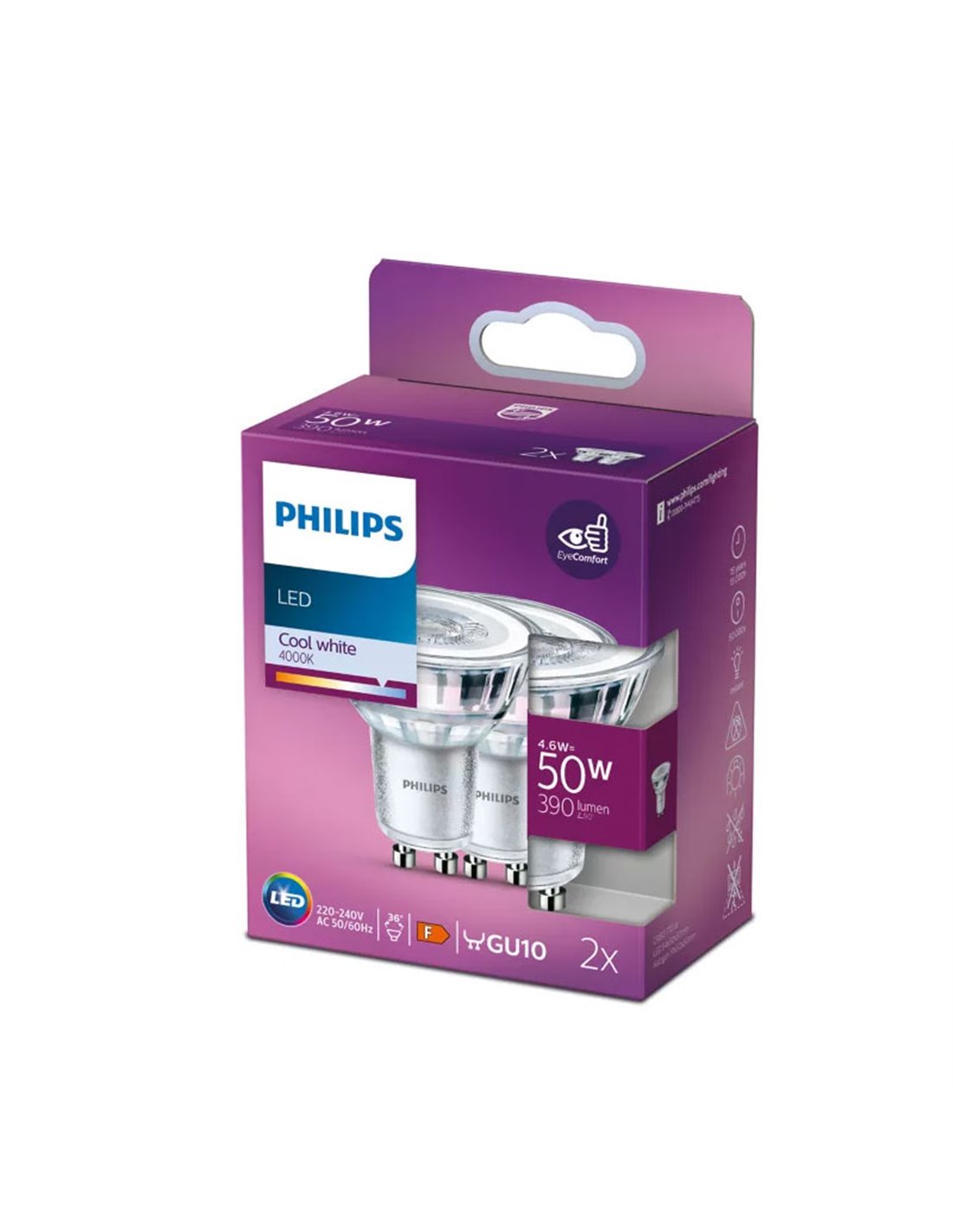 Lot de 2 ampoules Philips LEDClassic GU10 PAR16 de 4,6 W (équivalent 50 W ) avec une lumière de 4 000 K (blanc froid) et un faisceau de 36° . Elles fournissent un flux lumineux d' environ 390 lm avec une pointe à 770 cd pour un éclairage d'accentuation et général , un allumage instantané et la technologie EyeComfort . Non dimmable . Durée de vie de 15 000 h , facteur de puissance de 0,5 et classe F (EPREL 391859 ). Format PAR16 compact (Ø 50 × 54 mm ) et culot GU10 pour un remplacement direct dans les spots encastrés ou sur rail. Économisez de l'énergie tout en maintenant une lumière vive dans les cuisines, salles de bains, couloirs et espaces de travail.