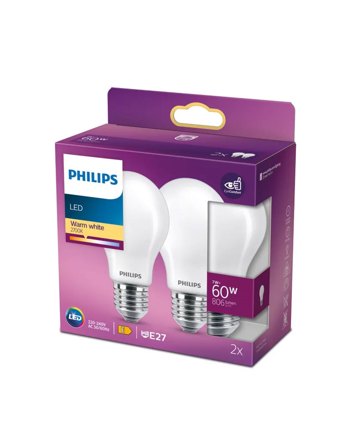 Ce pack de deux ampoules LED classiques Philips remplace directement les ampoules à incandescence de 60 W , consommant seulement 7 W par ampoule. Le verre opaque diffuse une lumière chaude et uniforme de 2 700 K (sans éblouissement), et le système EyeComfort assure un confort visuel optimal au quotidien.