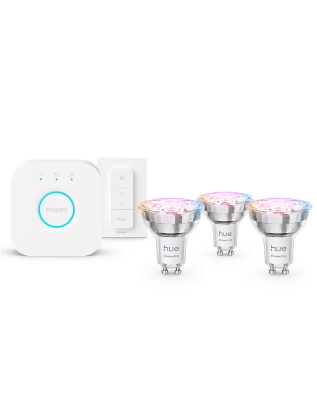 Avec le kit de démarrage Philips Hue Essential GU10, vous bénéficiez d'un contrôle total de vos lumières dès le premier jour : mobile, voix et variateur , avec la fiabilité du pont Hue .