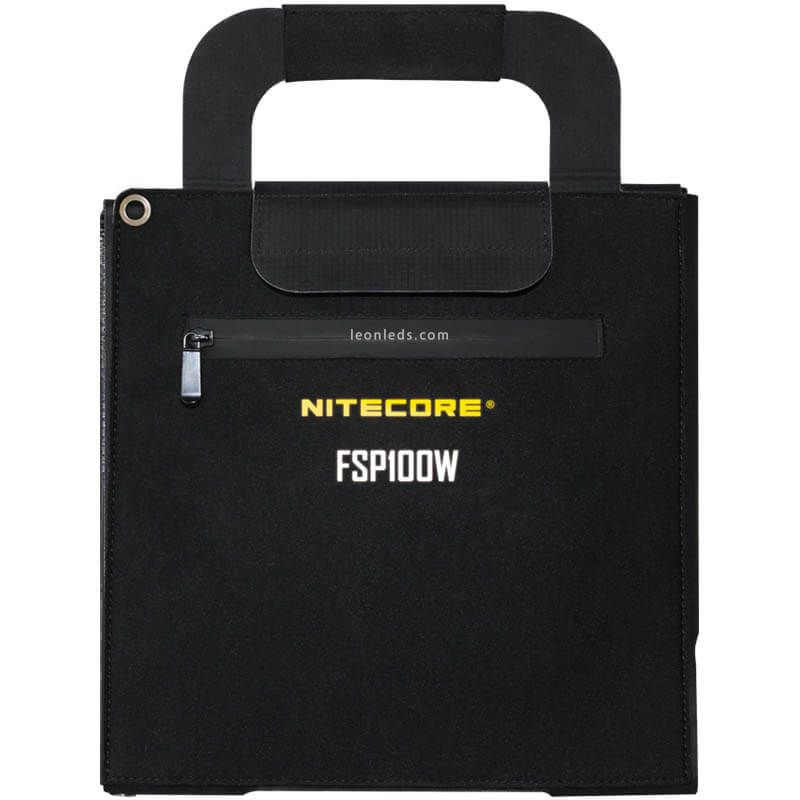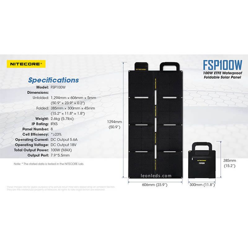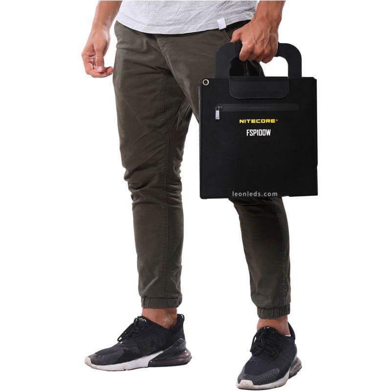Panel solar portatil de 100W modelo FSP100W de la marca Nitecore, un panel que se puede plegar y transportar con facilidad, se puede mojar y esta fabricado en material textil, se puede utilizar en embarcaciones, en caravanas, 4x4 o incluso en viviendas o al aire libre. Efficacité de plus de 23% et composé de 8 panneaux.