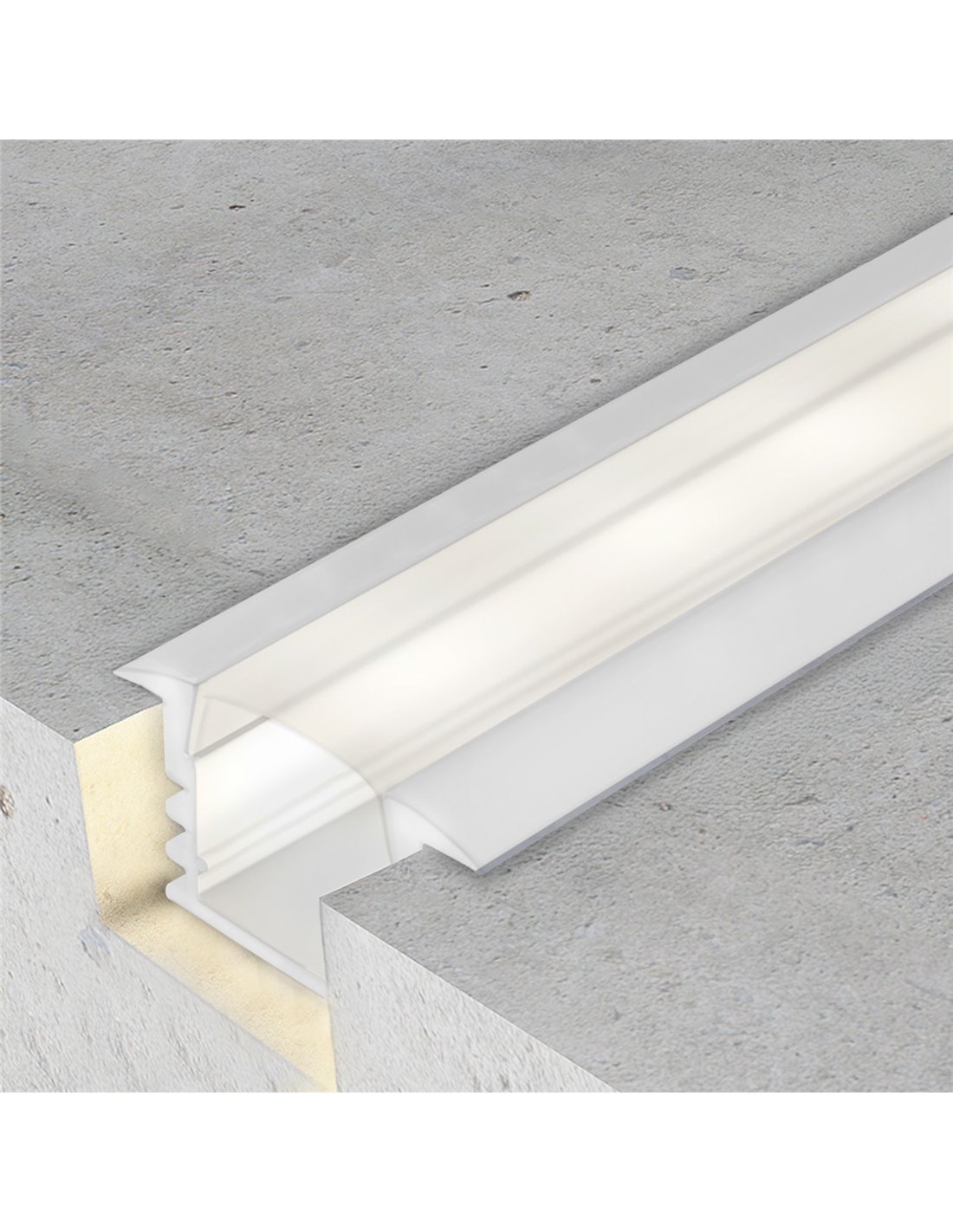 Profilé encastré de 2 mètres pour plaques de plâtre , finition laquée blanche , idéal pour l'intégration de rubans LED dans les plafonds et murs blancs. Fabriqué en aluminium extrudé , il protège le ruban et améliore la dissipation thermique. Il comprend un diffuseur translucide , deux embouts et deux supports de fixation , créant ainsi un faisceau lumineux continu et quasi invisible au plafond.
