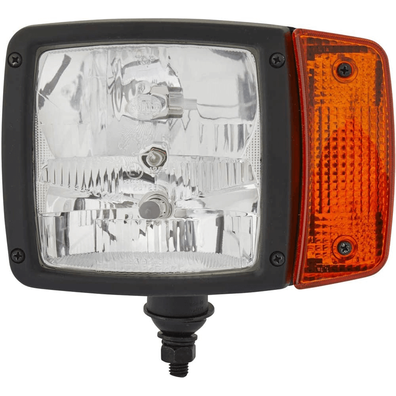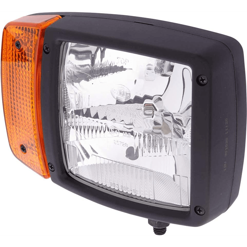 Phare avec ampoules halogènes H4 de 12V et 4 Fonctions, avec connecteur AMP et support inférieur, comprend un feu de position, un feu court, long et clignotant à l'avant et à l'arrière, ce modèle Hella est d'origine des marques Claas, Komatsu, Paul. ..