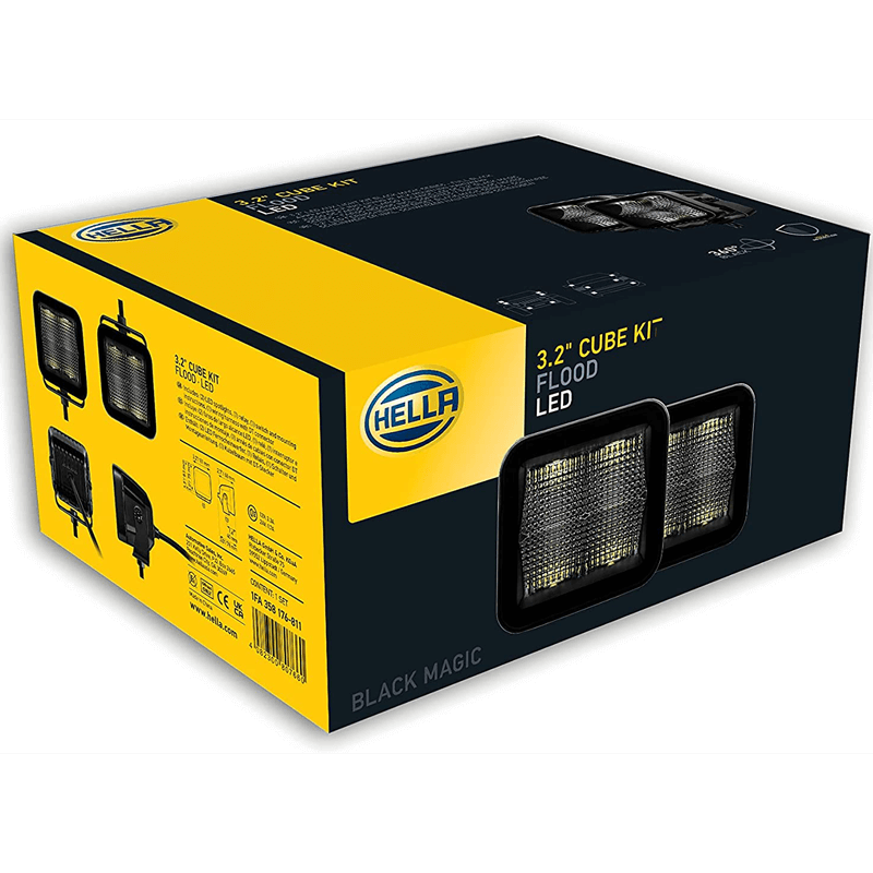 Pack de 2 unités de phares LED carrés Hella Black Magic Cube de 3,2 pouces, ces phares LED ont une puissance de 3000Lm avec une consommation de 40W, fonctionnent à des tensions de 10V à 30V et les optiques sont à large champ.