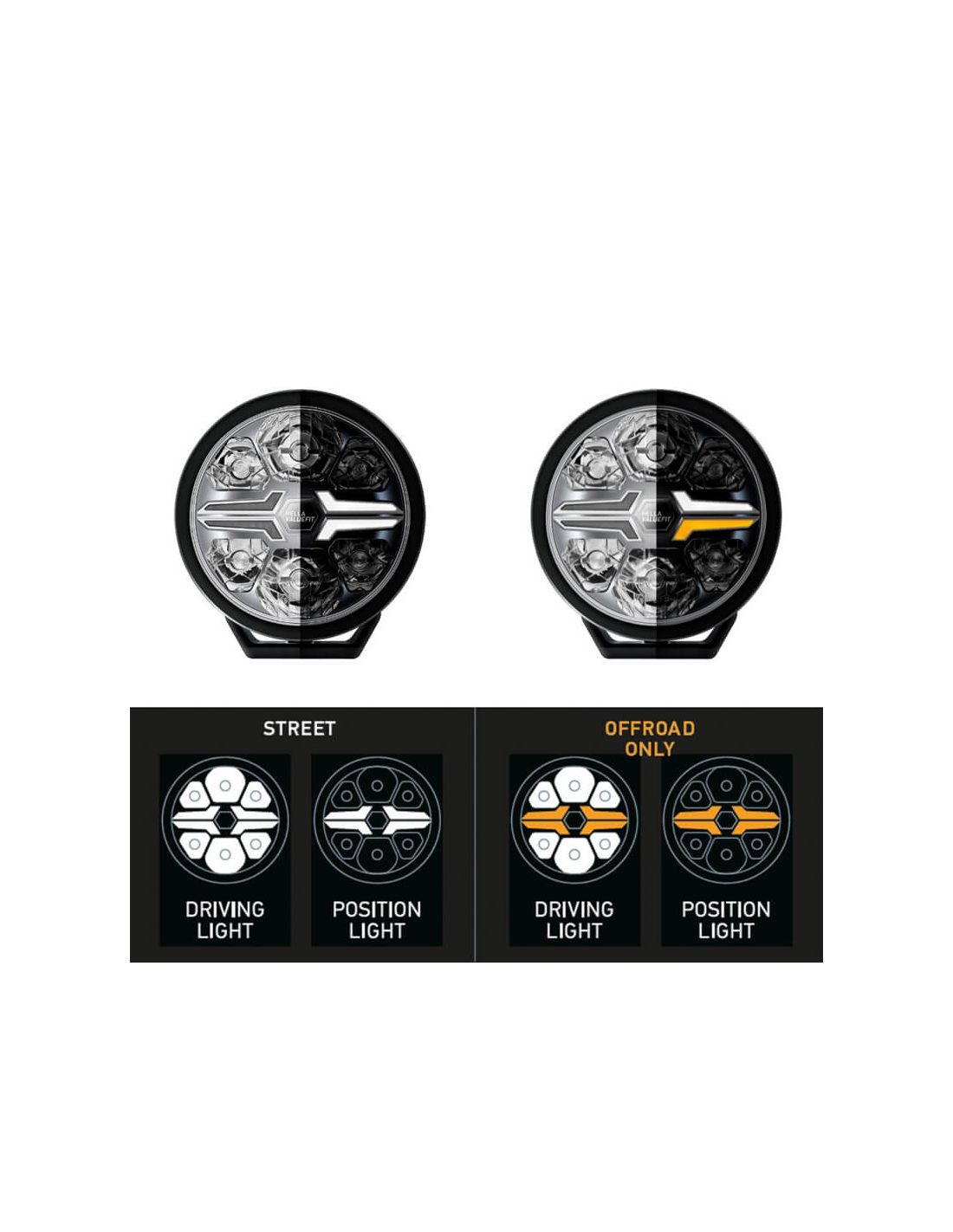 Phare LED noir avec feu de position ambre, blanc et feu longue portée Modèle Blade homologué d'un diamètre de Ø 18cm, à installer à l'avant des voitures, 4x4, OffRoad et camions d'une puissance de 22W valable pour 12V et 24V. Comprend un feu de position blanc et orange approuvé (non ECE), peut être connecté à l'aide du câble qui comprend 50 centimètres.