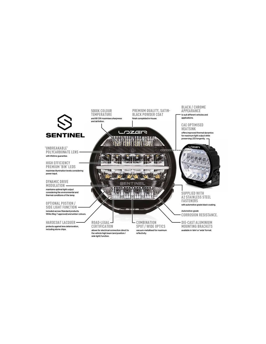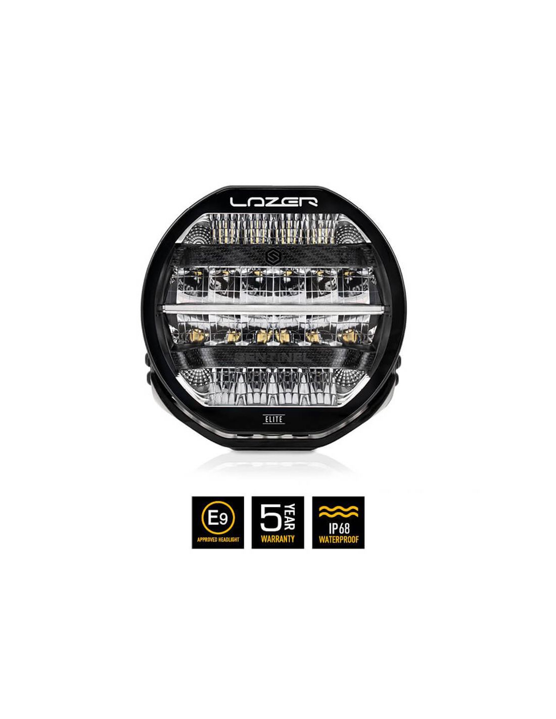 Phare LED haute performance Sentinel 9'' Elite Black , avec 15 232 lumens, technologie E-Boost, homologation ECE R112 et design élégant. Durabilité maximale avec protection IP68 et lentille en polycarbonate incassable.