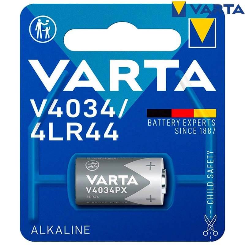 Pile alcaline de la marque Varta modèle V4034PX - 4LR44 d'une tension de 6V, ce modèle a un diamètre de 13mm et une longueur de 25,2mm.