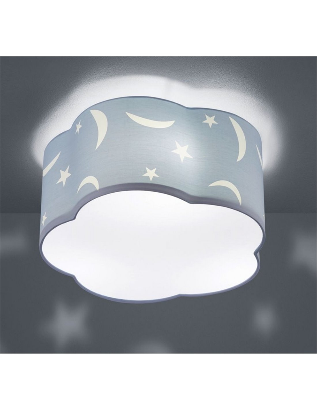 Plafonnier enfant bleu avec étoiles et lunes, avec un abat-jour de 40cm de diamètre qui permet d'installer 3 ampoules LED avec filetage E27 et diffuseur de lumière inférieur.