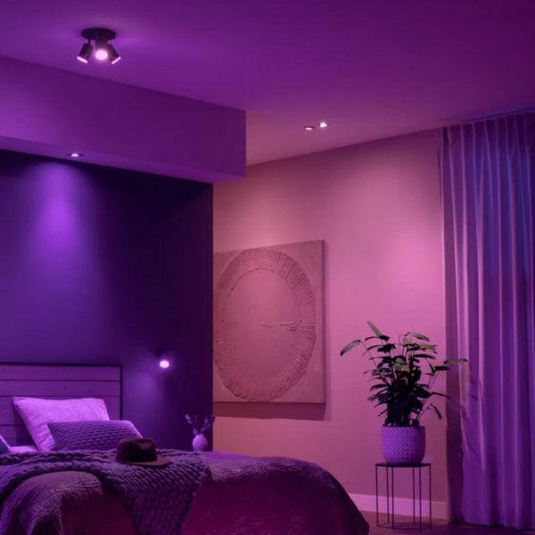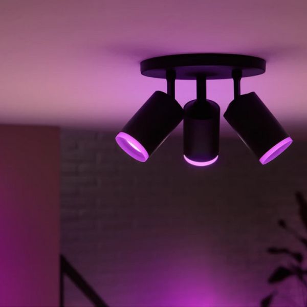 Le plafonnier intelligent Philips Hue FUGATO avec 3 spots LED noir offre un éclairage réglable de 2000K à 6500K et des millions de couleurs RVB. Doté de trois spots orientables et d'un flux lumineux total de 1200 lumens, il est parfait pour personnaliser l'éclairage de n'importe quelle pièce.