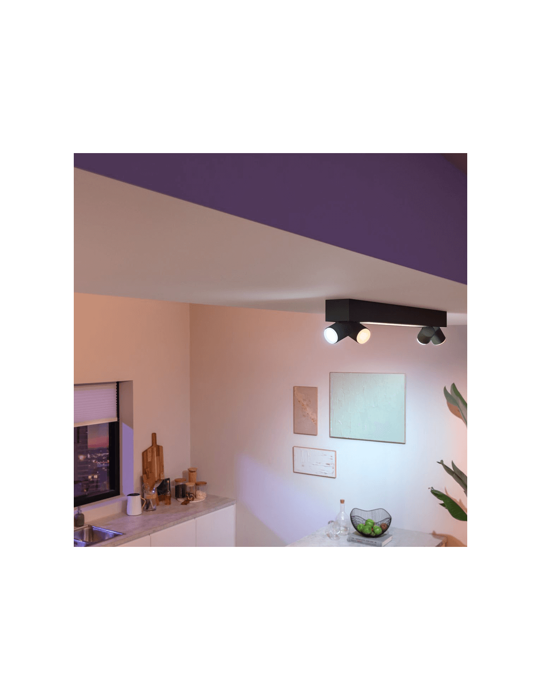 Le plafonnier LED intelligent Philips Hue CENTRIS en finition noire est une solution d'éclairage polyvalente qui combine un plafonnier fixe avec quatre spots réglables individuellement. Cette configuration permet d'éclairer toute la pièce tout en mettant en valeur des éléments spécifiques, en s'adaptant aux différents besoins d'éclairage et esthétiques.