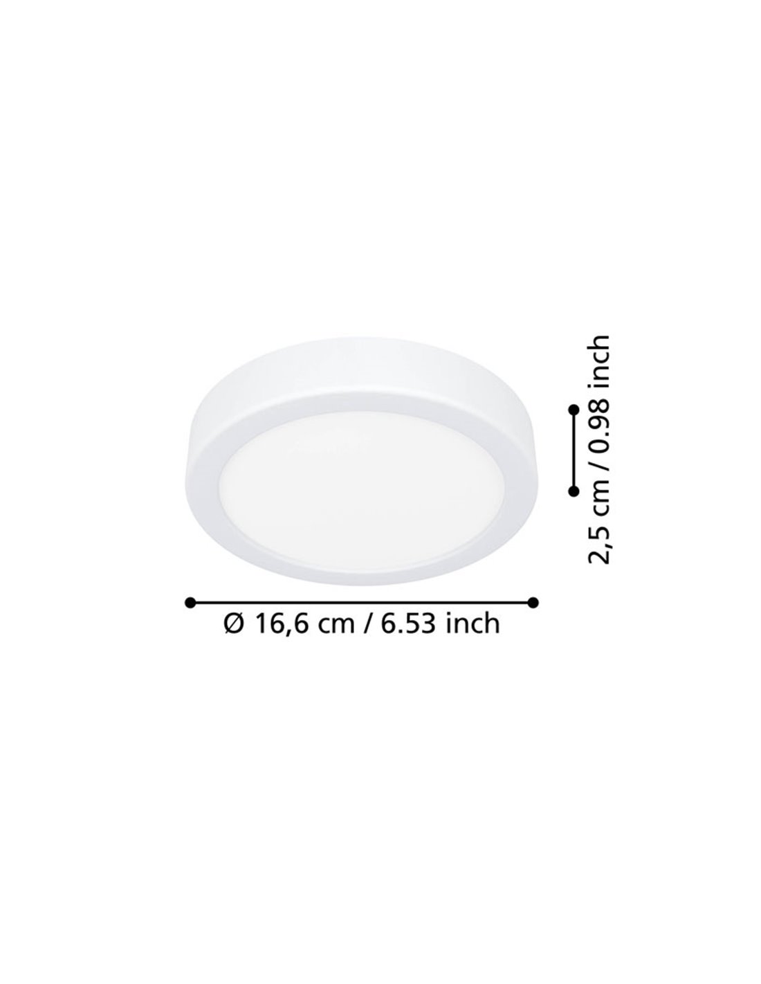 Plafonnier LED ultra-plat FUEVA 6, blanc, Ø 165 mm, 7,5 W, 1000 lm CCT, IP20 , design minimaliste, seulement 25 mm d'épaisseur. Il offre 7,5 W et 1000 lm avec une température de couleur CCT réglable (2700 K-6500 K). Dimensions : Ø 166 mm x 25 mm.
