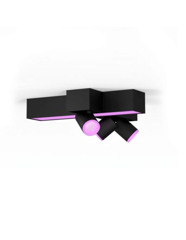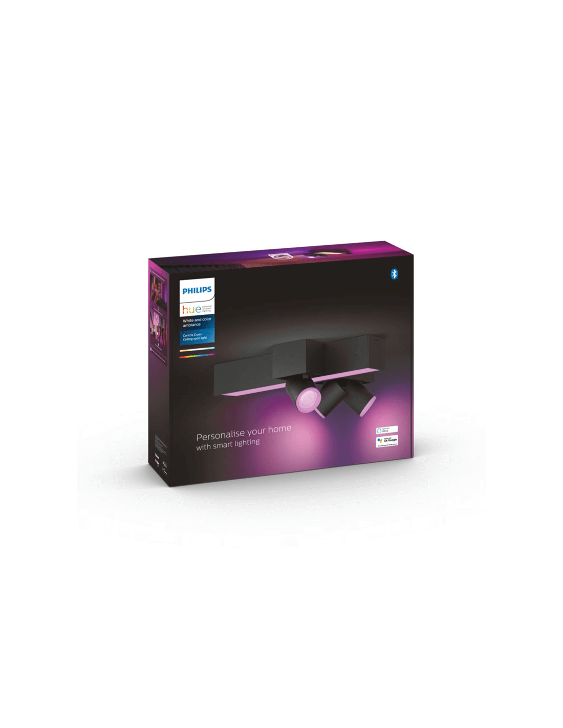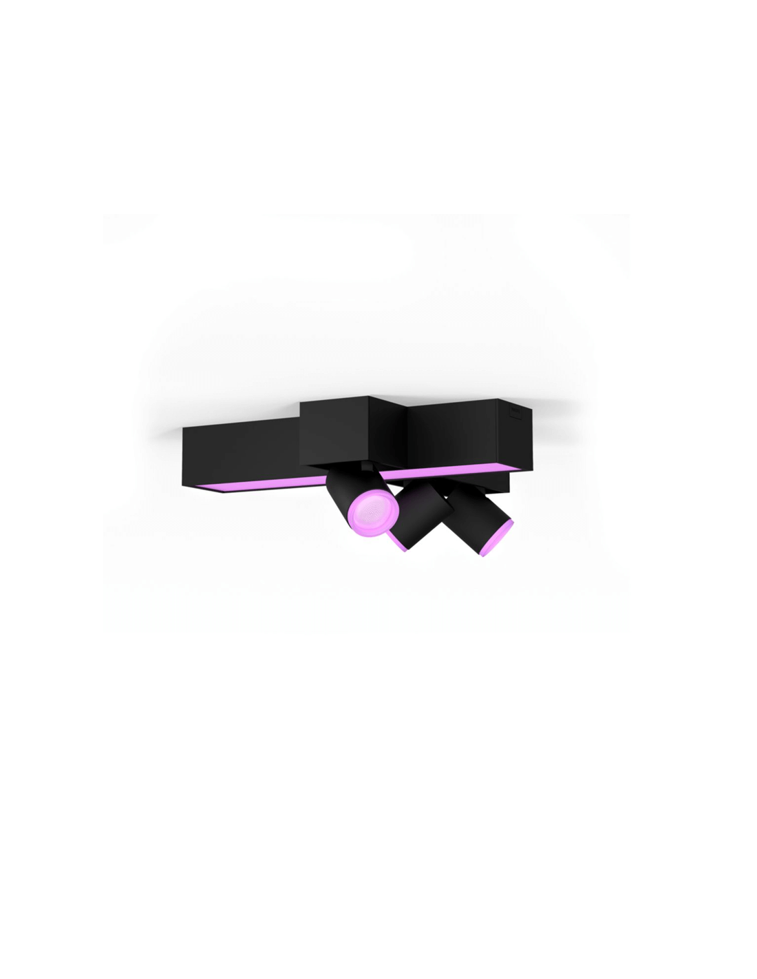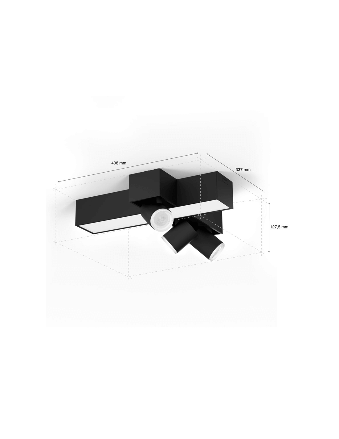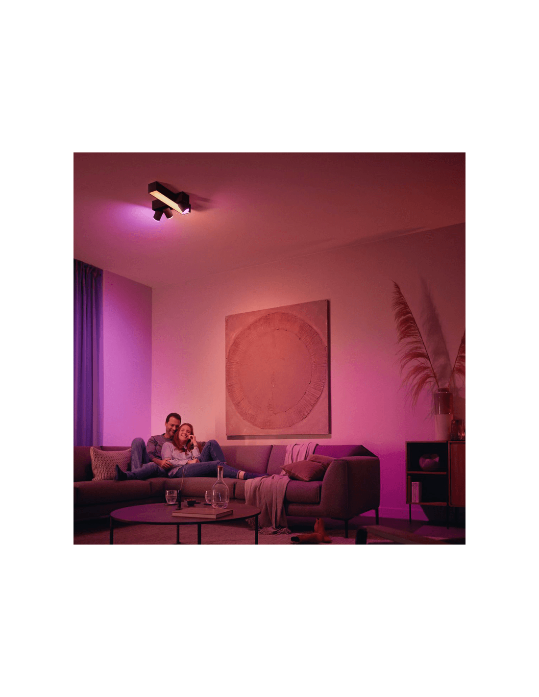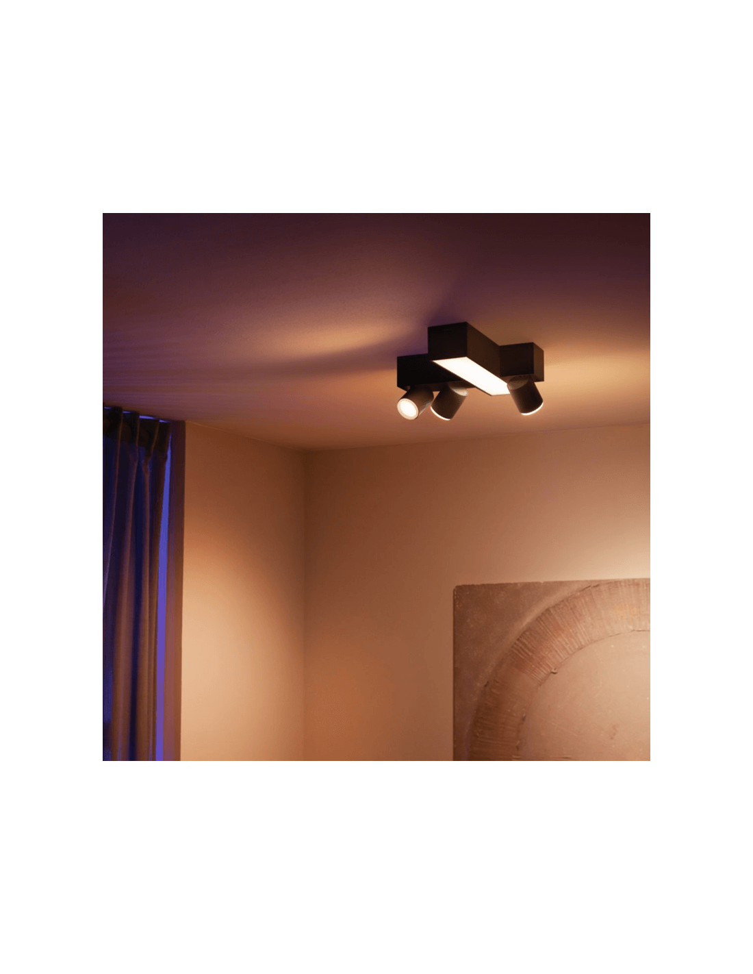 Le plafonnier Philips Hue CENTRIS LED noir associe un luminaire fixe à trois spots croisés orientables. Il offre une lumière variable de 2 000 K à 6 500 K et des millions de couleurs RVB, idéales pour personnaliser n'importe quel espace intérieur.