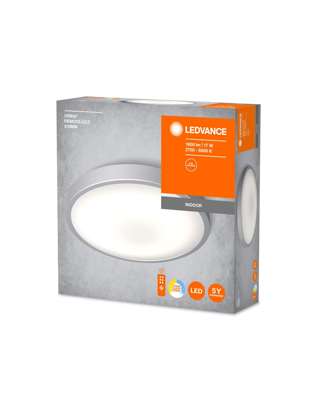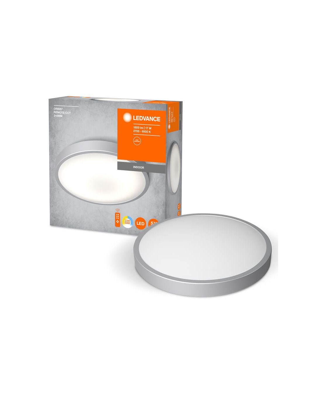 Plafonnier LED avec télécommande de la collection Orbis CCT Remote de LedVance qui offre une puissance de 17W , une intensité lumineuse réglable de 1 800Lm équivalent à 100W, une tonalité lumineuse réglable de 2700K (lumière chaude) à 6000K (lumière blanche), il comprend également un minuterie, mémoire pour ne pas perdre la programmation précédente de l'intensité lumineuse et de la tonalité, et fonctions de nuit, le tout contrôlable à l'aide de la télécommande incluse.