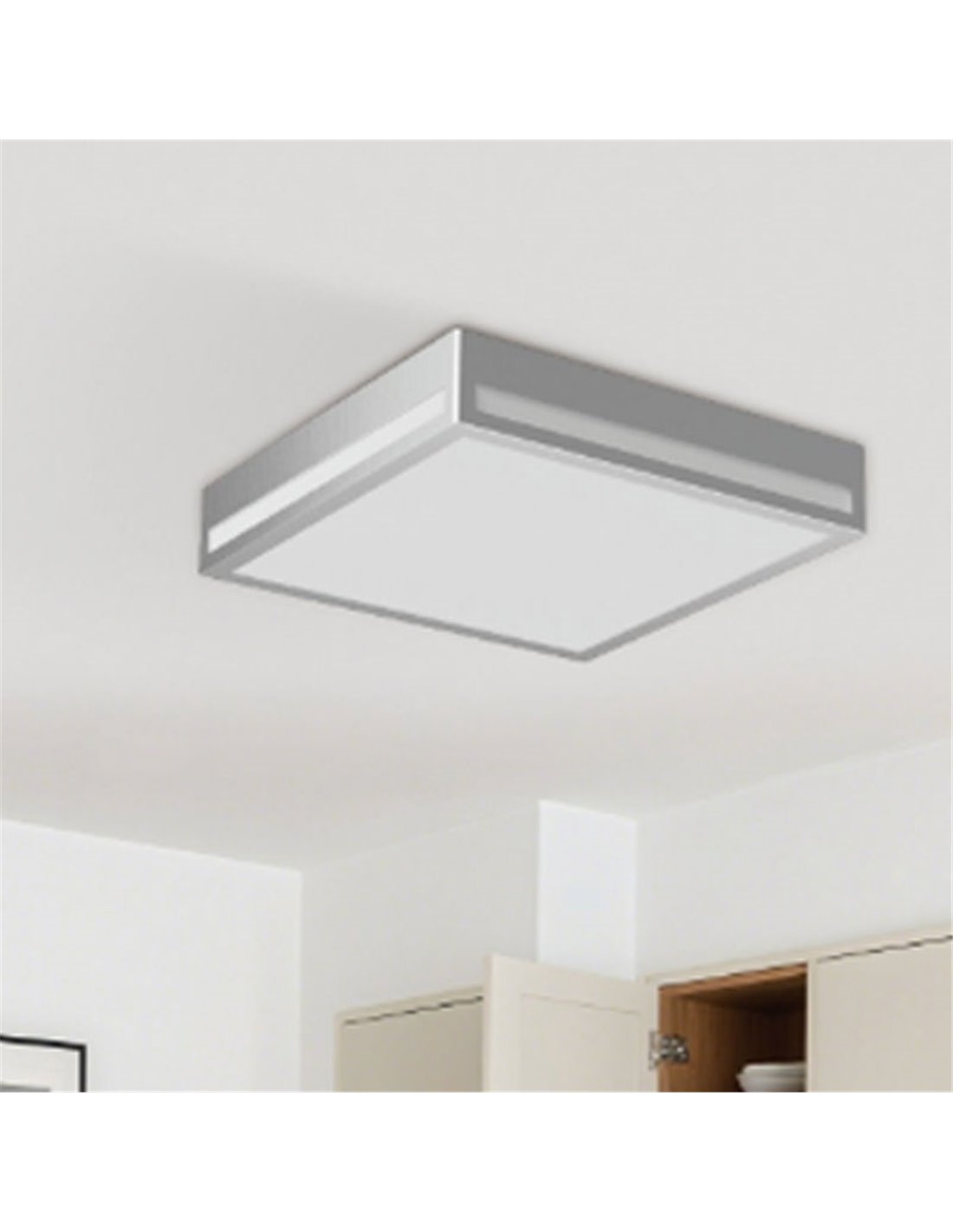Ce plafonnier LED carré argenté (IP44) est idéal pour éclairer les cuisines modernes, les salles à manger, les salons, les couloirs, les larges espaces communs des bureaux et des magasins. Sa finition métallique s'intègre harmonieusement aux intérieurs contemporains et industriels, tandis que son diamètre de 380 mm permet d'éclairer de grandes surfaces avec moins de luminaires, créant ainsi un éclairage continu et agréable.