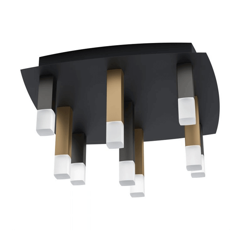Le plafonnier LED Estanterios est en métal noir et comporte neuf colonnes métalliques de différentes longueurs en or et marron foncé. Le boîtier en aluminium et en acier est doté d'un abat-jour en plastique au fini satiné. Concernant les mesures du produit, nous soulignons une longueur de 42 cm, avec une hauteur de 23,5 cm et un poids de 3,02 kg.