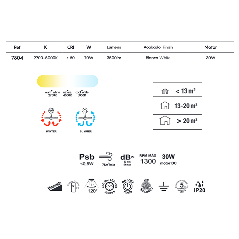 Ce ventilateur silencieux et plafonnier LED présente un design moderne et minimaliste, composé de 7 pales en ABS et d'un cadre blanc. Il intègre une LED d' une puissance de 70 W et d'une intensité lumineuse de 4 900 lm, soit l'équivalent de plus de 300 W d'une ampoule traditionnelle.