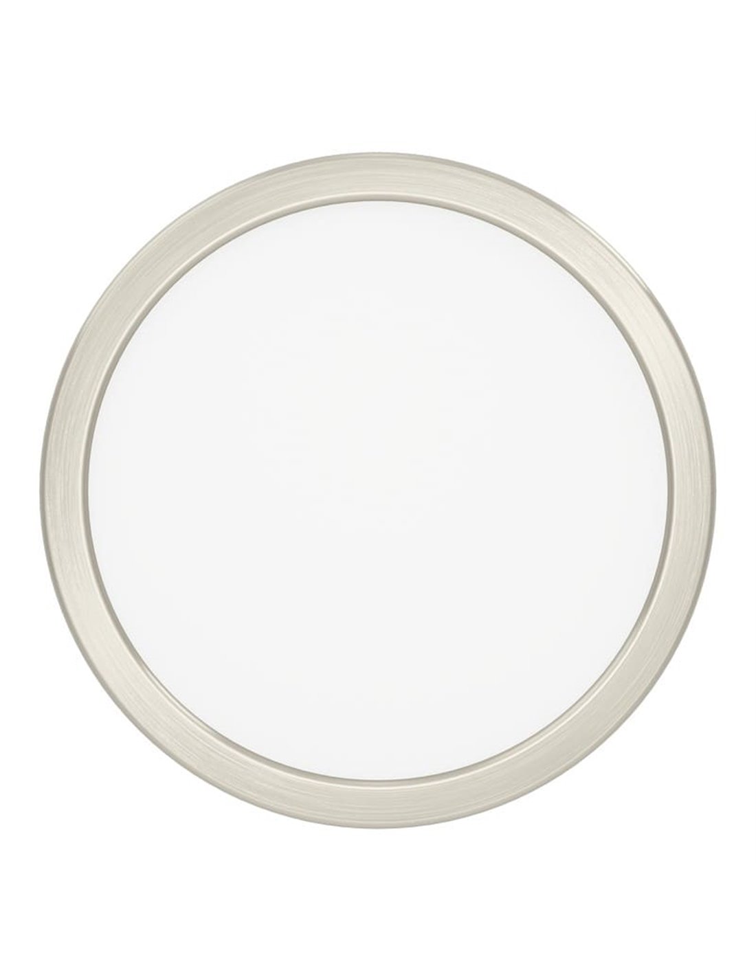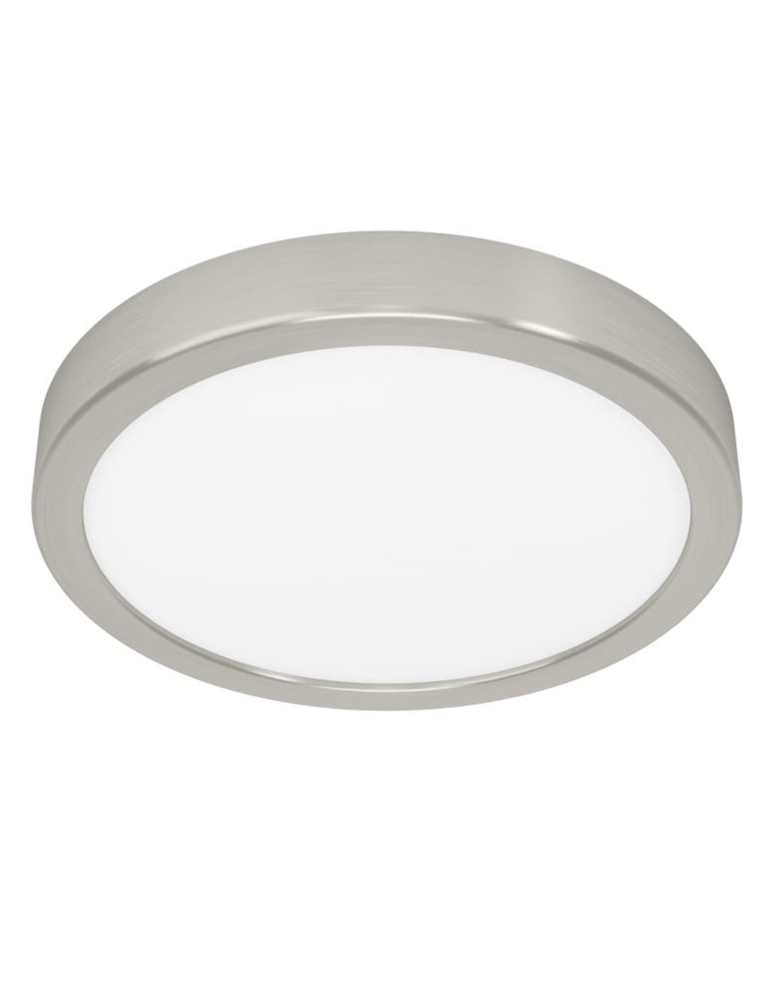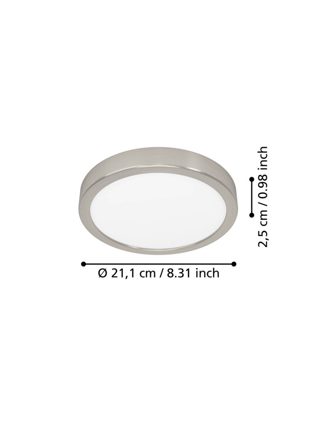 Plafonnier LED FUEVA 6 nickel satiné, Ø 210 mm, 11,5 W, 1550 lm, CCT IP20 . Design ultra-plat de 25 mm, intensité variable CCT 2700 K / 4000 K / 6500 K et 1550 lm. Dimensions : Ø 210 mm x 25 mm.