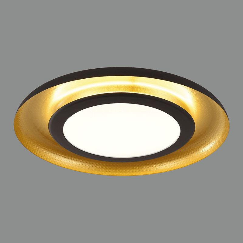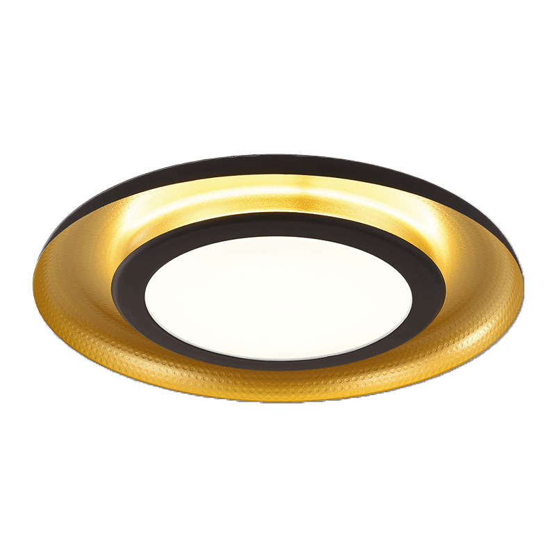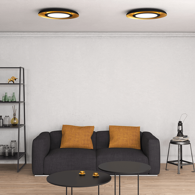 C'est un plafonnier circulaire en métal. Sa structure noire est associée à des détails dorés qui lui donnent cette touche glamour et sophistiquée. A l'intérieur se trouve la LED intégré qui confère à ce plafonnier une puissance lumineuse de 56W et 4560Lm . Cette puissance combinée à sa température de couleur de 3000K en blanc chaud, font de ce plafonnier l'élément d'éclairage qu'il vous faut dans votre intérieur.