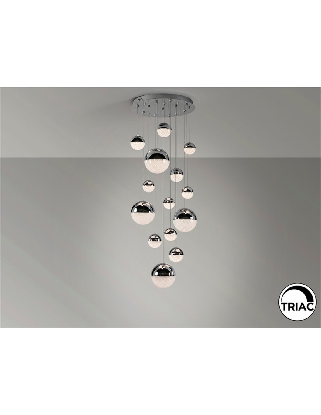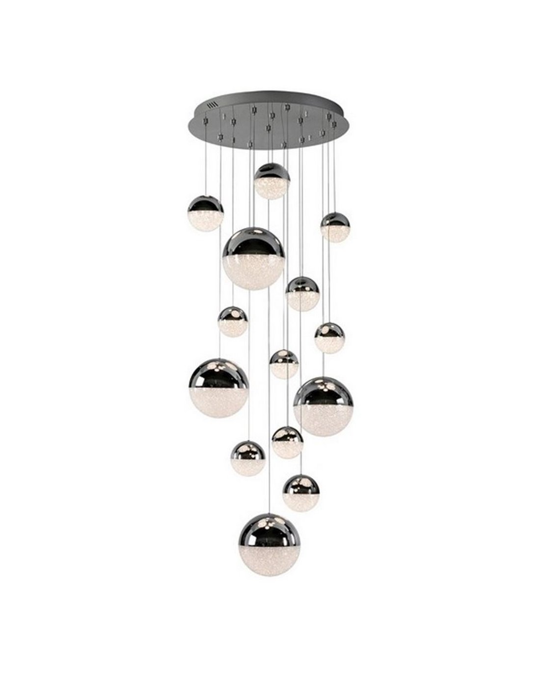 La suspension SPHERE à 14 lumières est conçue pour devenir la pièce maîtresse des vastes pièces à vivre. Sa structure en métal chromé se marie à des abat-jour sphériques de 10, 12 et 20 cm , en polycarbonate texturé à l'intérieur et finition chromée, créant ainsi des reflets doux et une esthétique moderne et lumineuse.