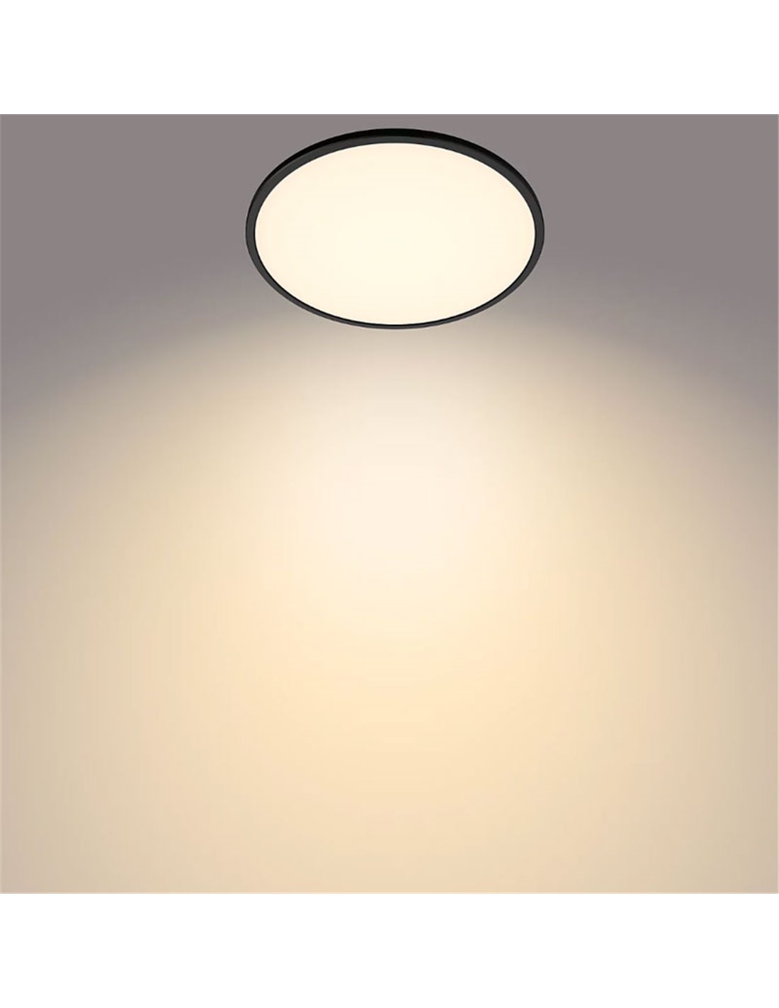 Plafonnier LED Superslim noir, 18W, avec lumière très chaude de 2700K. Intensité réglable, parfaite pour les environnements confortables.
