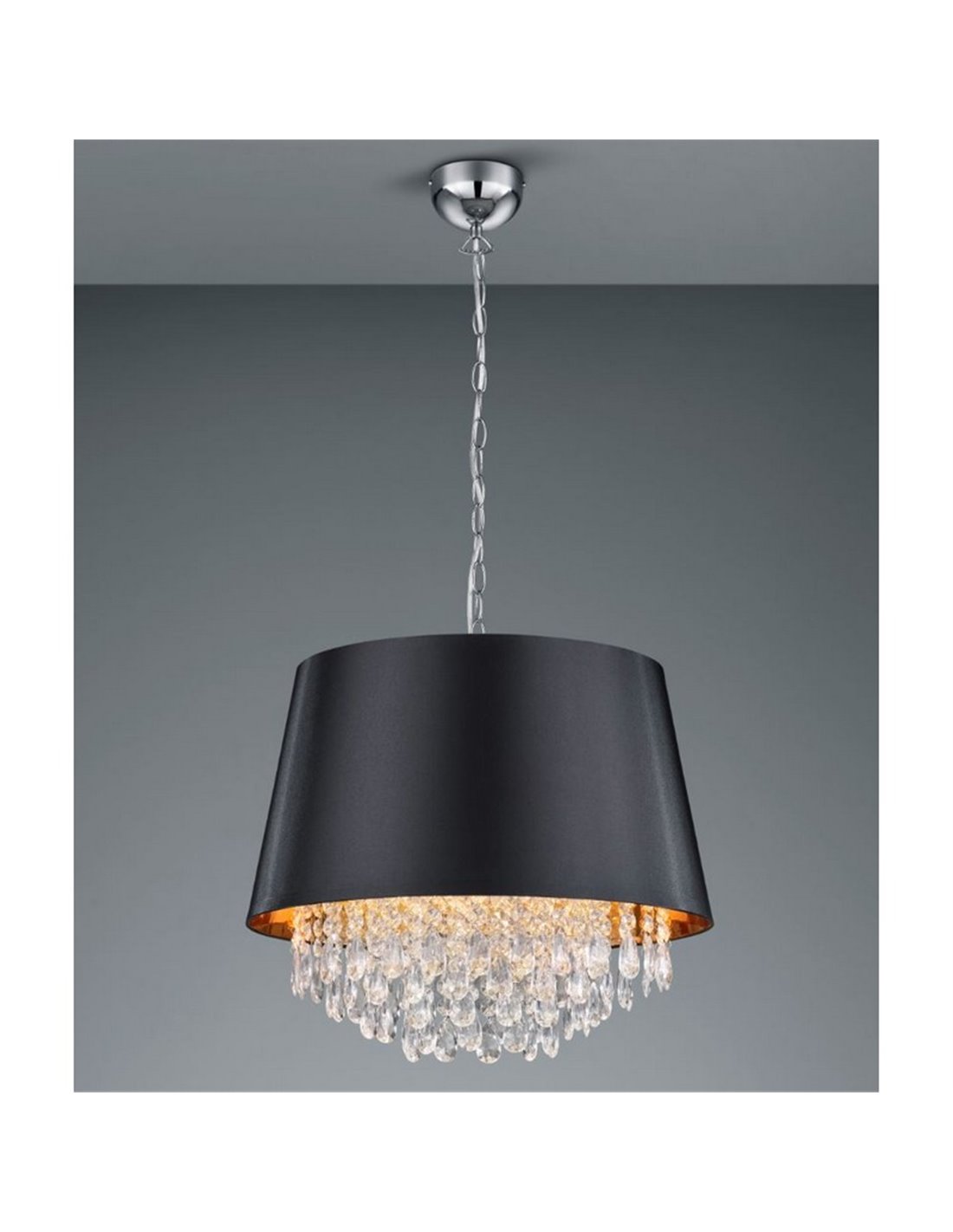 Le plafonnier LORELY allie l'élégance d'un lustre classique à un style moderne. Son extérieur noir et son abat-jour intérieur doré contrastent avec les cristaux suspendus , créant des reflets uniques qui apportent de la personnalité à n'importe quelle pièce.
