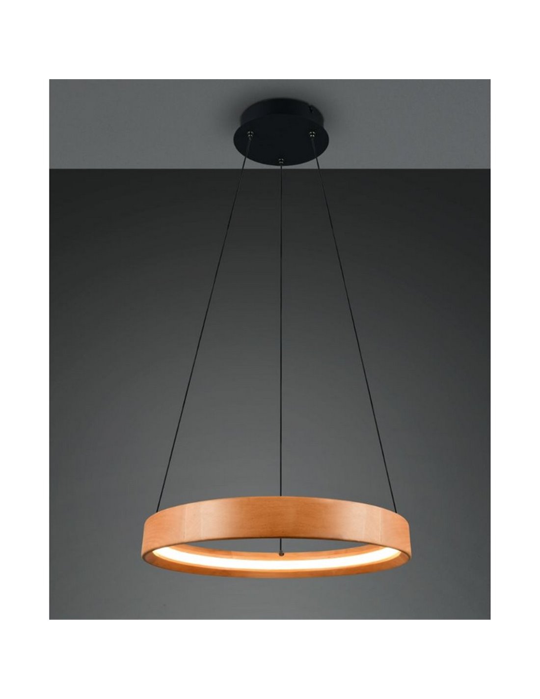 Plafonnier LED LYNWOOD de 50 cm de diamètre, en bois naturel . Il offre une puissance de 28 W et 3 300 lumens pour une lumière chaude de 3 000 K. Il est réglable en hauteur, gradable par interrupteur et doté d'une fonction mémoire.
