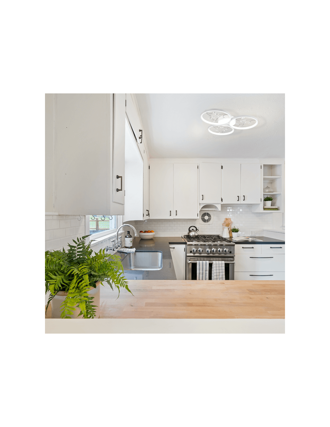 Le plafonnier Groovy se présente avec un design original dans une finition blanche et en métal. Commençons par ses dimensions où il offre une hauteur de 6 cm, un diamètre de 62 cm et un poids de 1,49 kg. Mesures parfaites pour son application à la maison.