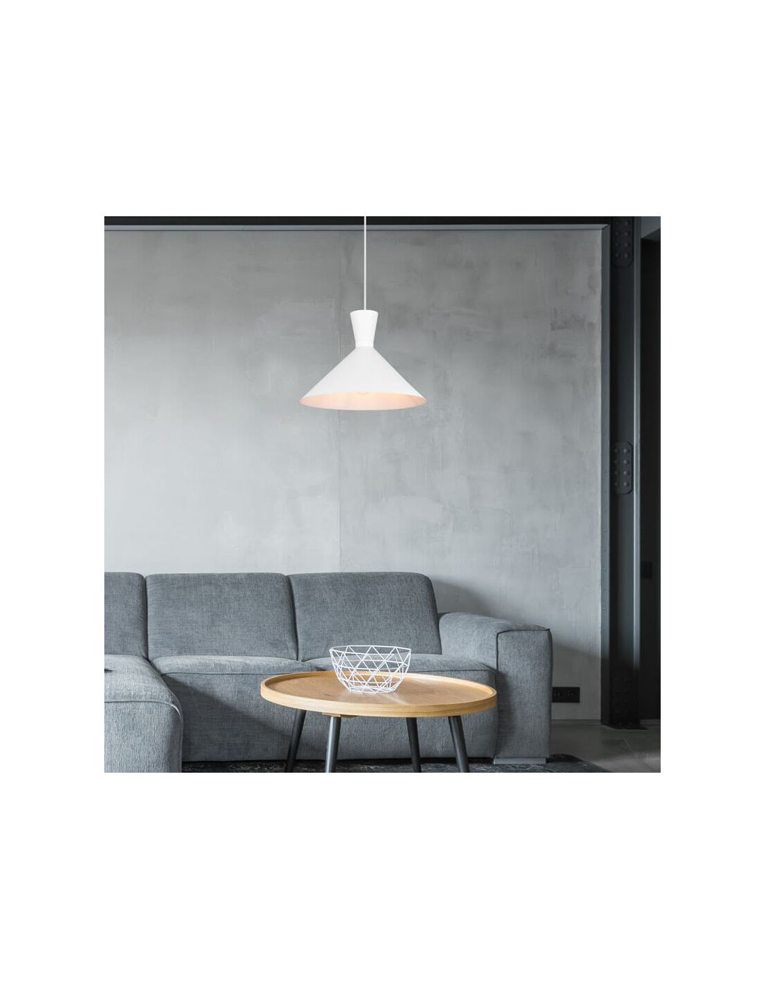 La lampe suspendue Enzo a un corps en métal disponible en différentes couleurs : nickel mat, blanc et noir avec un abat-jour dans les mêmes tons pour générer le meilleur effet lumineux décoratif. Il a un design que vous allez adorer et s'intègre parfaitement dans n'importe quelle pièce intérieure telle que les chambres, les cuisines, les salons ou les bureaux. Une pièce qui donne une touche minimaliste et intime au coin où elle se trouve.