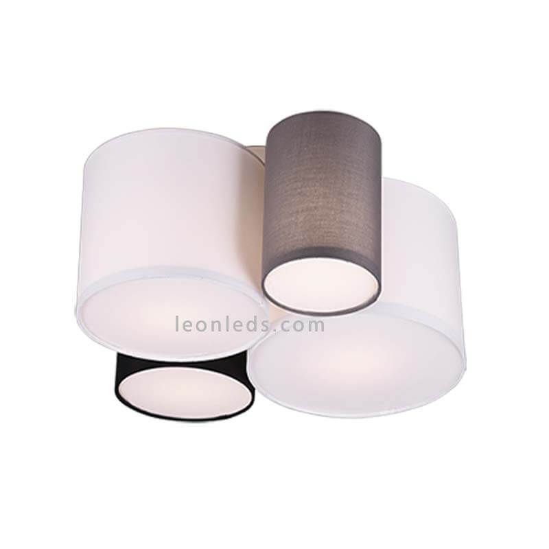 plafonnier textile de la collection Hotel de la marque Trio Lighting permettant d'installer 4 ampoules LED à l'intérieur, ce plafonnier est composé de 4 plafonniers circulaires joints en blanc, noir et gris (Ampoules non incluses), vous pouvez voir les dimensions sur une des photos .