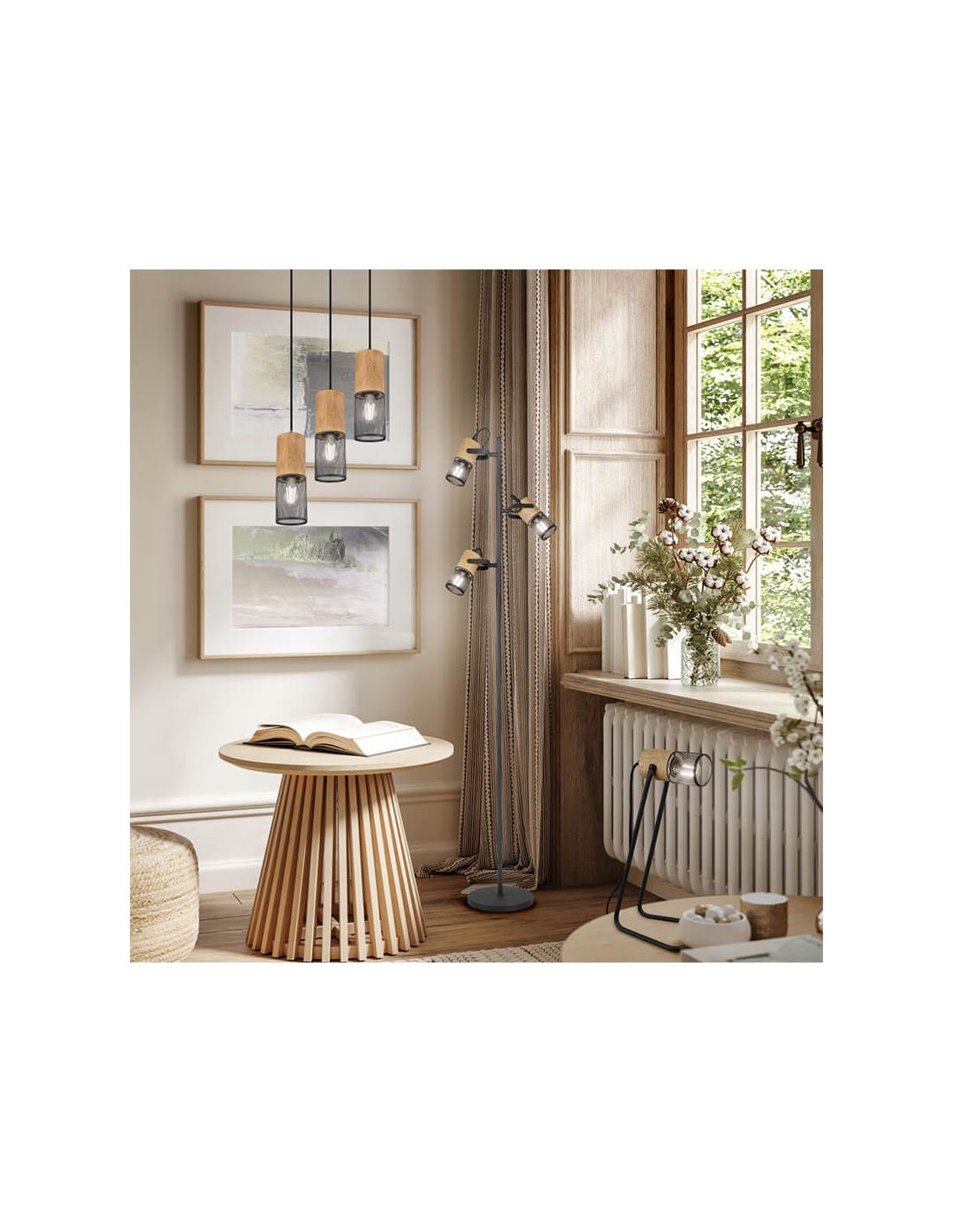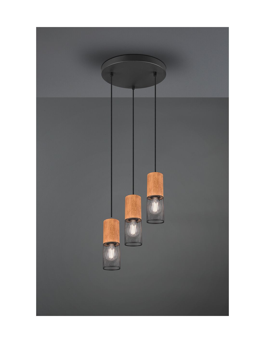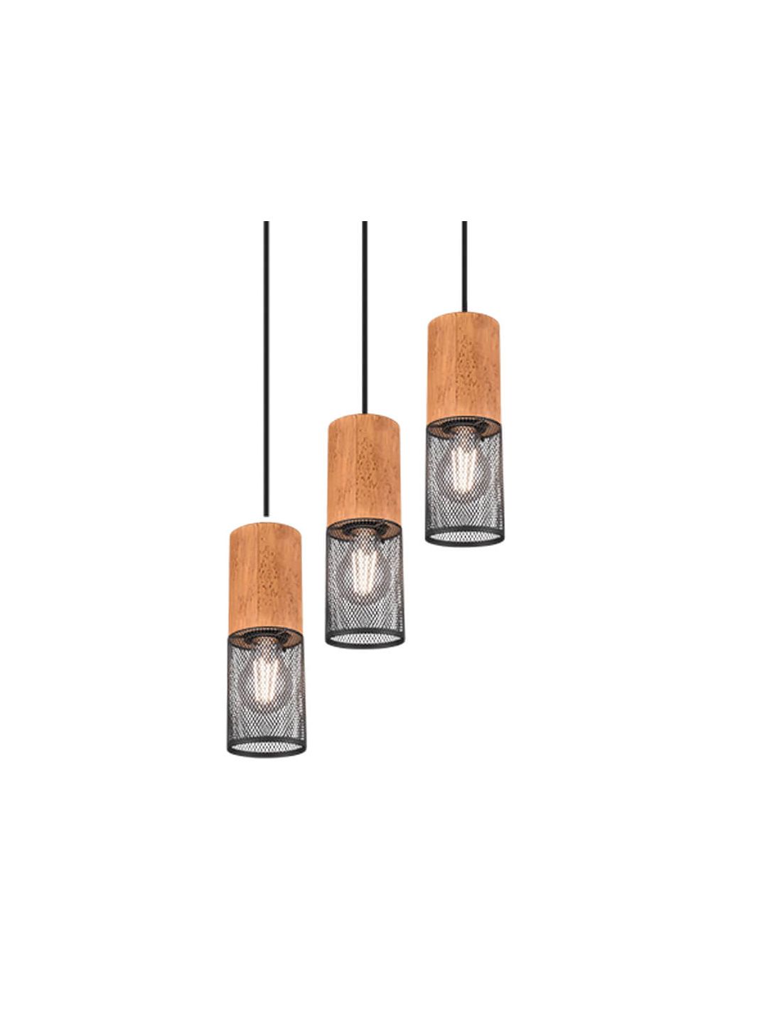 Plafonnier LED vintage avec 3 spots en bois et métal de la collection Tosh de Trio Lighting. Il dispose de 3 spots suspendus avec des abat-jours en forme de filet en métal noir et de trois bases en bois qui se connectent à trois câbles noirs. Ces câbles se connectent à une base métallique qui est installée au plafond. Nécessite l'installation de 3 ampoules E27 (non incluses) d'un maximum de 40W. Vous pouvez choisir le ton clair que vous préférez en fonction de la pièce et de sa taille. Chez LeónLeds, nous recommandons l'installation d'ampoules de style vintage à filament visible pour mettre en valeur leur style rétro-industriel.