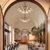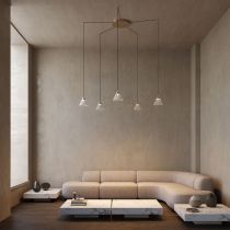 Suspension KOPA avec 4 points lumineux E27, laiton mat et bois de noyer