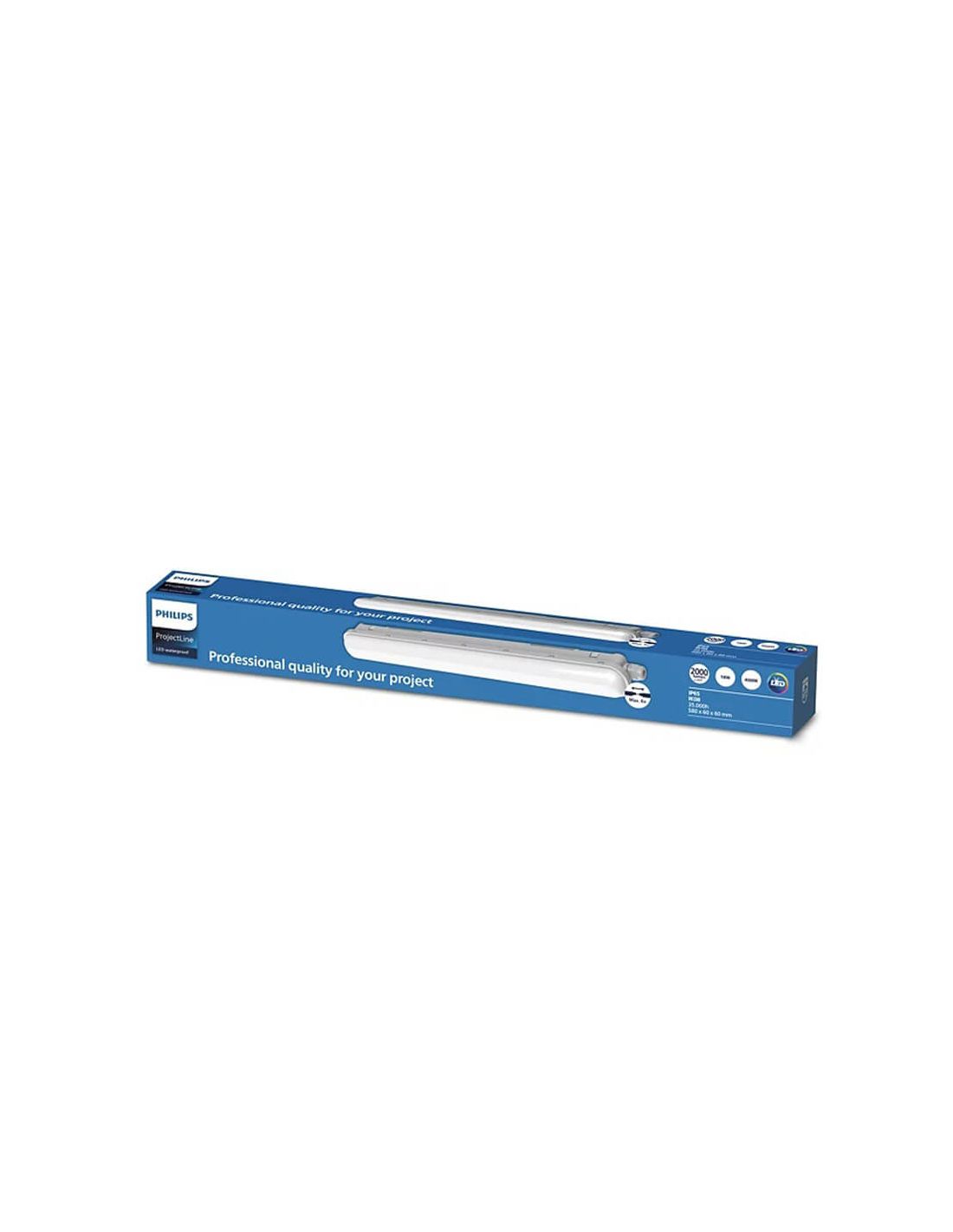 Écran LED étanche de 60 cm de long d'une puissance de 18 W, offrant 2 000 Lm d'intensité lumineuse à 4 000 K et un faisceau lumineux de 110º, protection de classe II. Cet Écran est complètement étanche et résistant aux chocs, IP65 et IK08, comprend tout le nécessaire pour l'installation, gamme Philips ProjectLine, permet de connecter jusqu'à 6 Écrans en Ligne.
