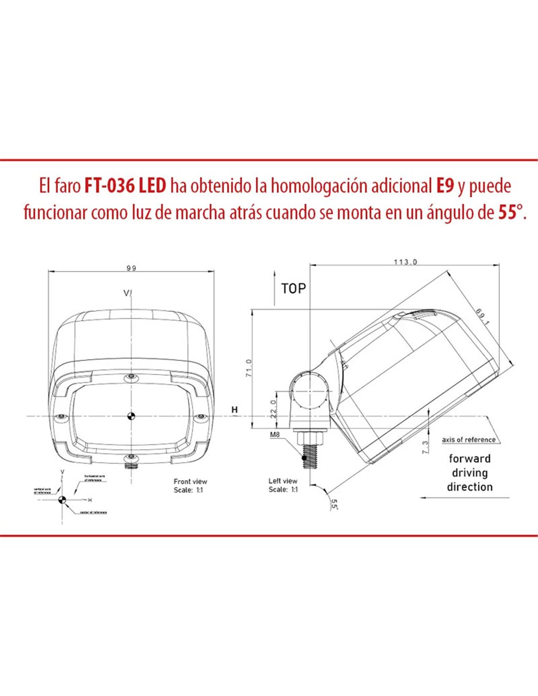 Projecteur de travail LED Fristom FT-036 ( 15 W , 1 800 lm à 6 000 K , électronique 12-36 V CC , protection IP68) . Homologations : ADR , EMC R10 et E9 . Le projecteur FT-036 est également homologué E9 et peut servir de feu de recul lorsqu'il est monté à un angle de 55° . Il est fourni avec un câble de 1,5 m , un support réglable et est conforme aux normes CEM pour éviter les interférences radio. Dimensions : 100 × 100 × 75 mm . Des couvercles interchangeables sont disponibles.