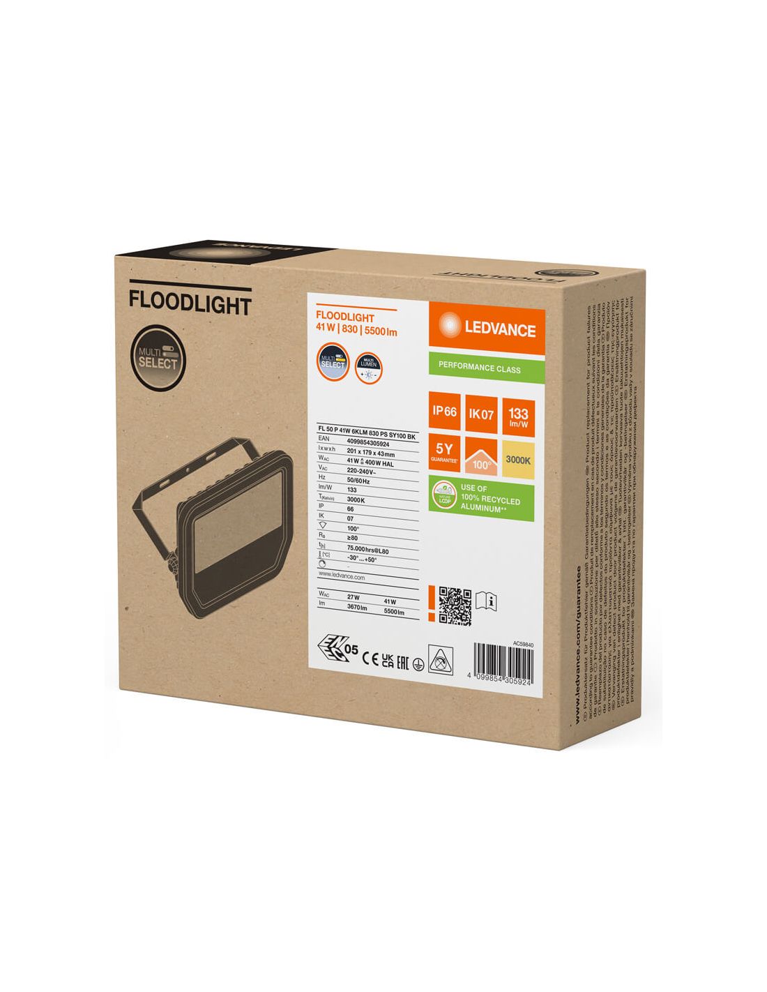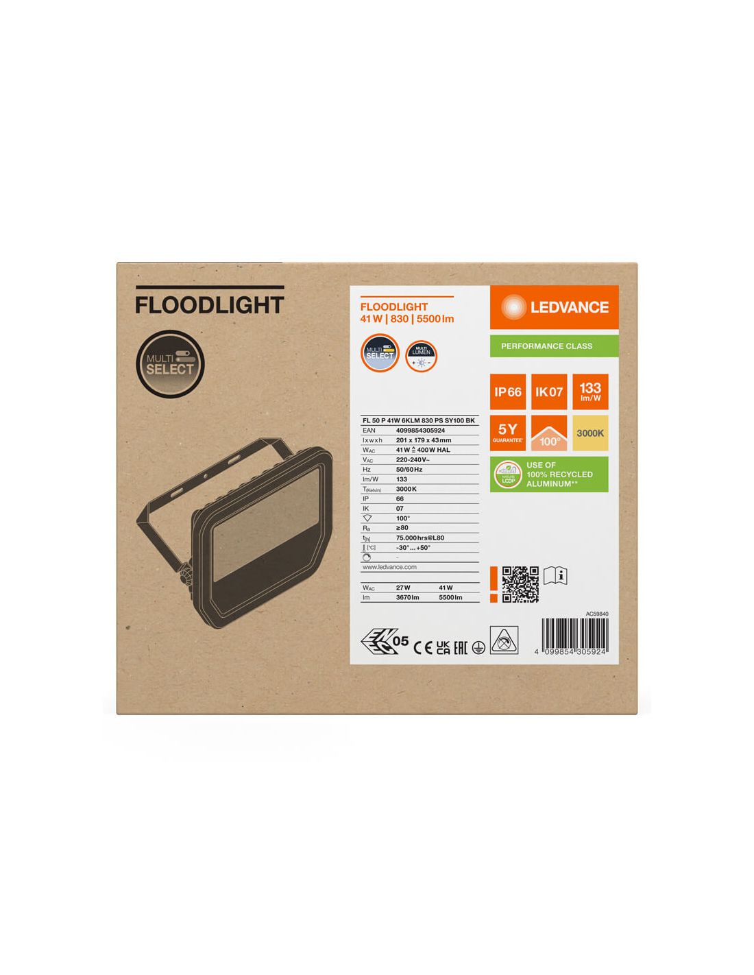 Projecteur LED d'extérieur noir 41W de Ledvance . Il offre 6000 lumens avec une protection IP66, des températures de couleur de 3000K, 4000K et 6500K et une conception robuste pour les façades, les jardins et les espaces publics. Garantie 5 ans . Il dispose d'un sélecteur de puissance de 5 500 Lm et 3 670 Lm en 3 000 K et 6 000 Lm et 4 000 Lm et 4 000 K et en 6 500 K, garantie de 5 ans sur la gamme LedVance Performance, optique symétrique. Protection contre les surtensions 4Kv.