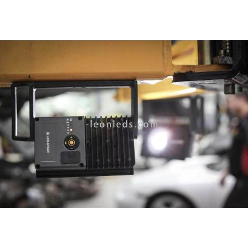 La base de ce projecteur est magnétique , elle nous permet de maintenir le projecteur LED sur une zone métallique sans aucun problème, cette base peut être tournée permettant à la lumière d'être dirigée et l'aimant puissant garantit un maintien parfait à tout moment. En appuyant de plus en plus, nous pouvons régler l'intensité lumineuse de ce projecteur LED, de la puissance maximale de 4 500 Lm à un minimum de 10 % de sa puissance.