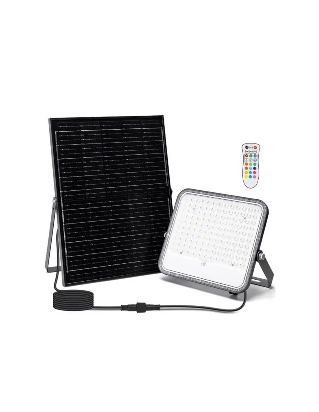 Projecteur solaire LED RGB 200 W avec 16 couleurs statiques et 3 modes dynamiques. Comprend un panneau solaire monocristallin de 20 W, une batterie de 16 000 mAh, un câble de 2 mètres et une protection IP66. Idéal pour un éclairage décoratif extérieur sans fil.
