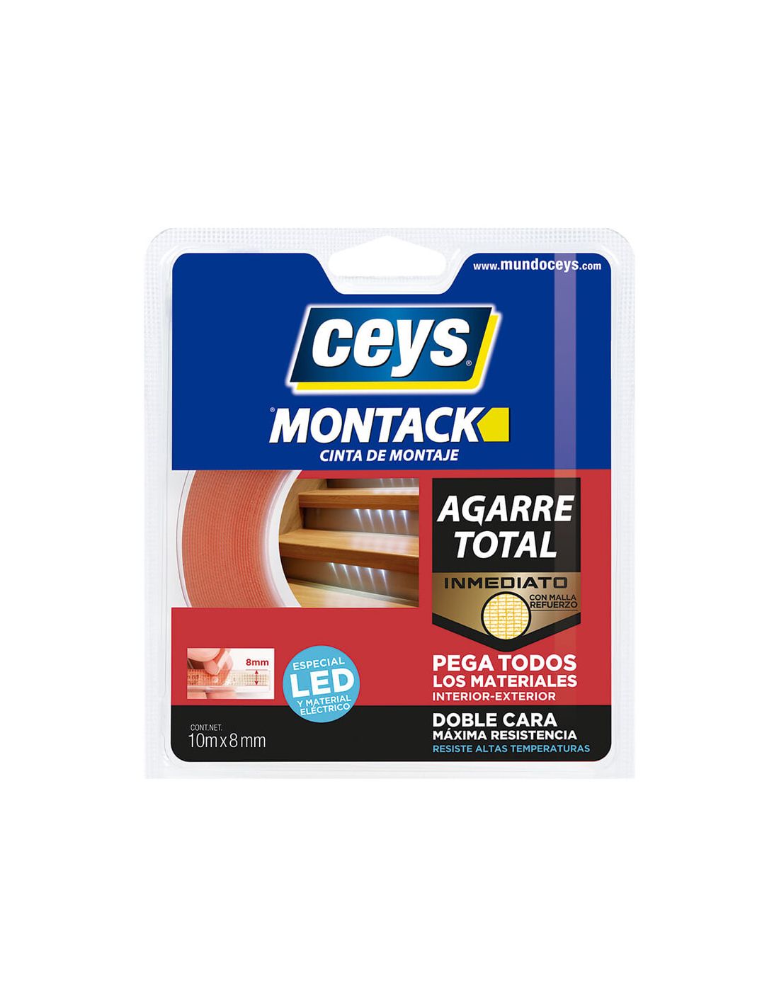 Le ruban adhésif double face CEYS Montack, spécialement conçu pour les LED 8 mm x 10 m , est idéal pour fixer les bandes LED, les moulures et les profilés sans clous ni vis. Adhérence ultra-forte et nette.