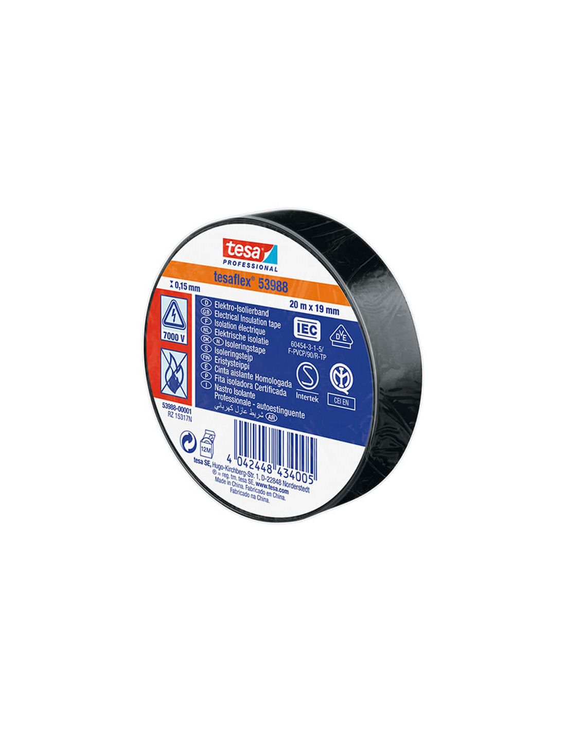 Ruban isolant homologué Tesa Professional 53988 noir, 19 mm x 20 m, en PVC souple de haute qualité. Résistant à la chaleur jusqu'à 90 °C, avec une tension diélectrique de 7 000 V , il offre une excellente adhérence et une grande durabilité.