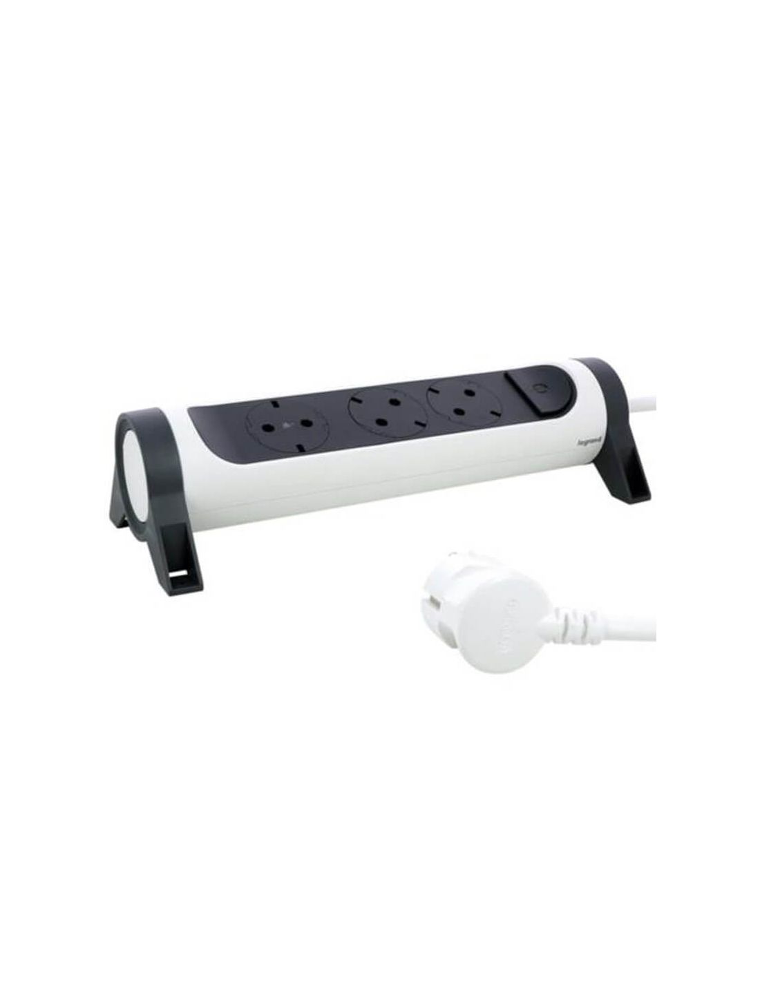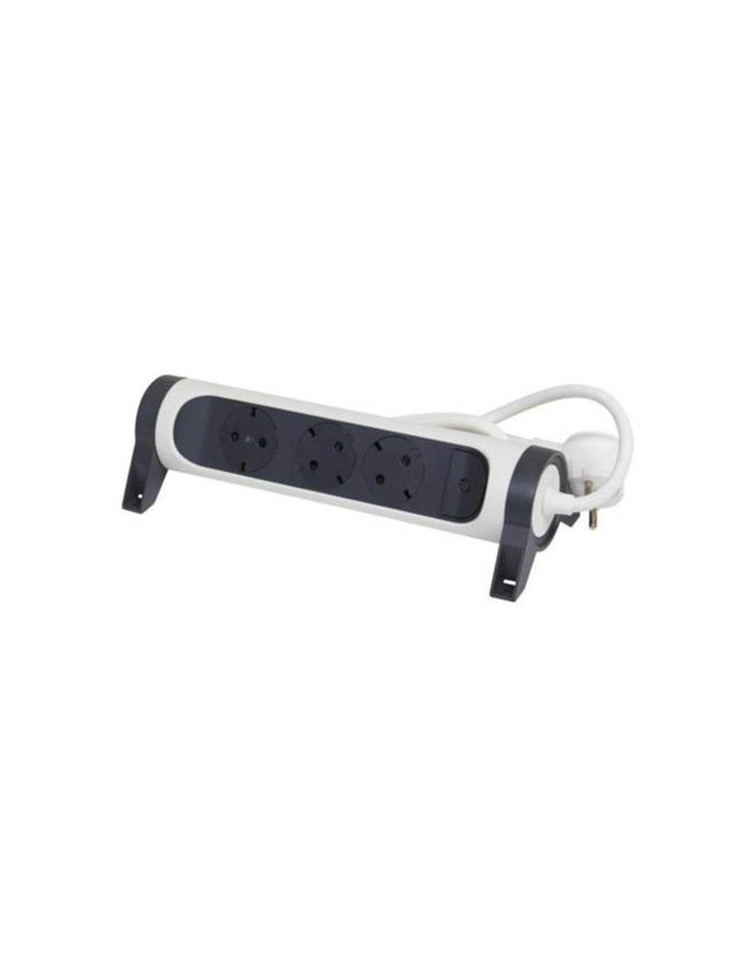Socle multiple avec 3 prises encastrées 2P+T , 1,5M de câble 3X1,5mm2 noir et blanc de Legrand, ce modèle comprend un interrupteur lumineux bleu et des supports rotatifs aux extrémités qui permettent de fixer le socle avec des vis.
