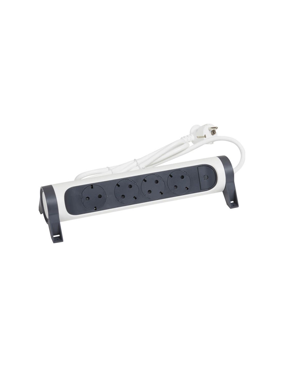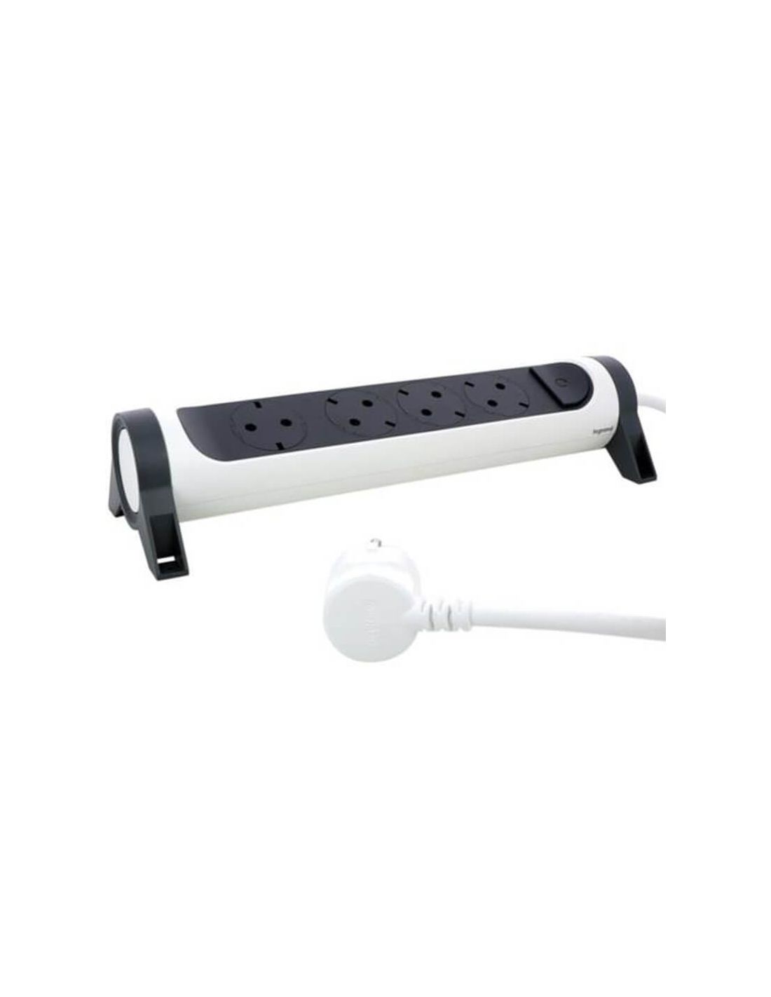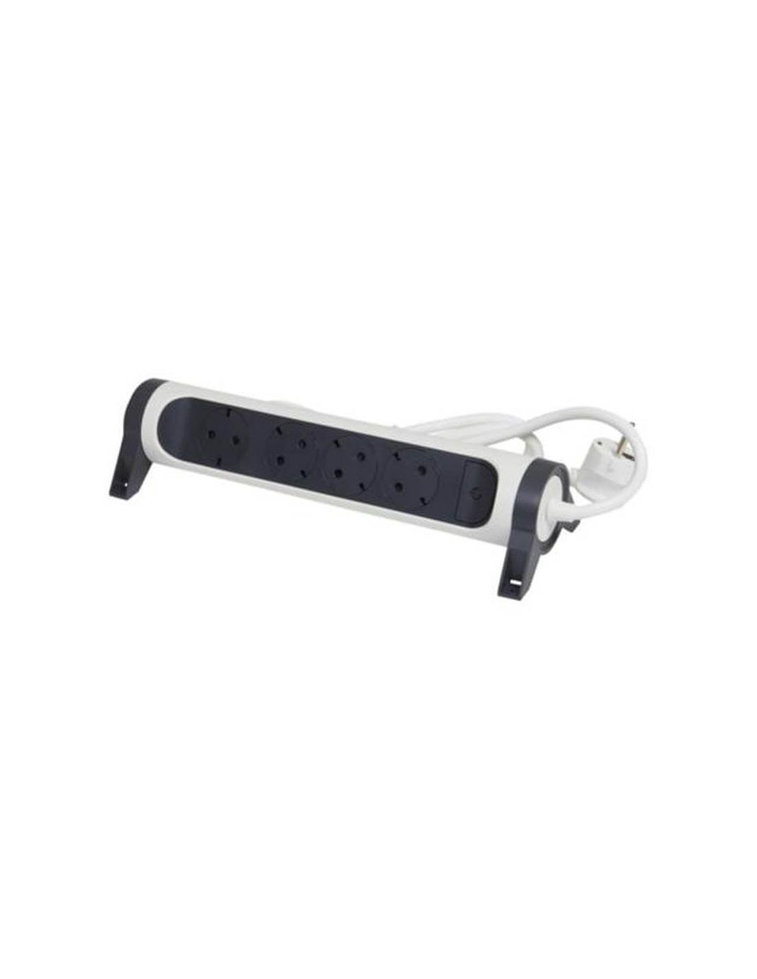 Socle multiple avec 4 prises encastrées 2P+T , 1,5M de câble 3X1,5mm2 noir et blanc de Legrand, ce modèle comprend un interrupteur de lumière bleue et des supports rotatifs aux extrémités qui permettent de fixer le socle avec des vis.