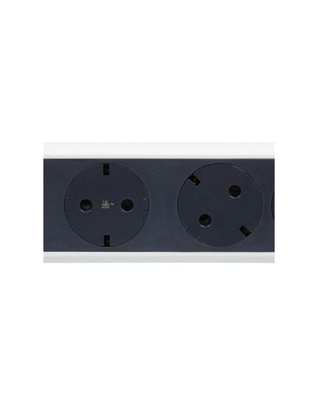 La base multiple dispose d'une prise avec un angle de 90º pour pouvoir connecter un transformateur sans bloquer une autre prise. Le reste des plans est orienté à 45°. Il dispose d'un interrupteur ON/OFF lumineux en bleu et de plusieurs possibilités de fixation : sur un mur ou une surface à l'aide de vis ou d'une bride (non fourni dans le pack). Câble PVC 3G blanc de 1,5M de long et 1,5mm² de section.