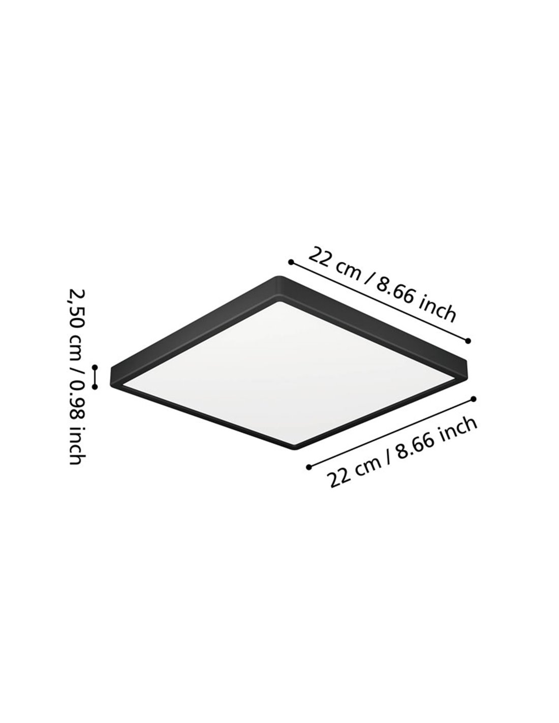 Le downlight LED carré noir en saillie FUEVA 6 220 x 220 mm, 10,5 W, 1200 lm, CCT (2700 K-4000 K-6500 K), IP44, pour salle de bains, fait partie de la série FUEVA 6 d'EGLO, conçue pour un éclairage sûr dans les salles de bains et les cuisines grâce à son indice de protection IP44 . Son design ultra-plat de 28 mm et son diffuseur satiné assurent une lumière uniforme et non éblouissante .