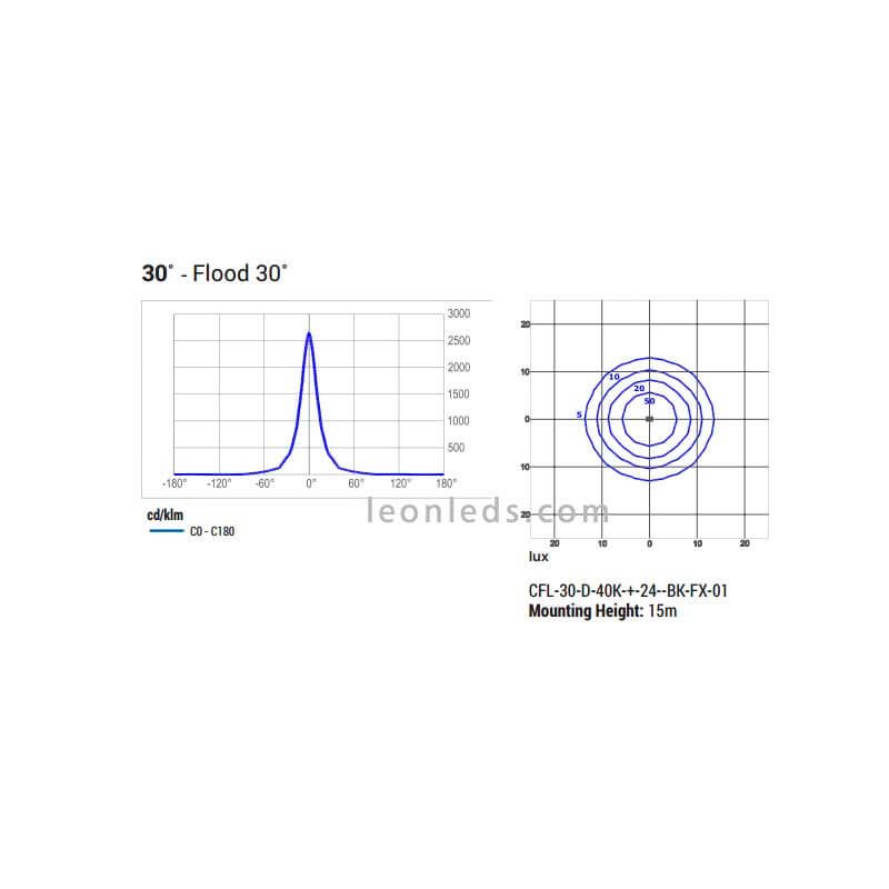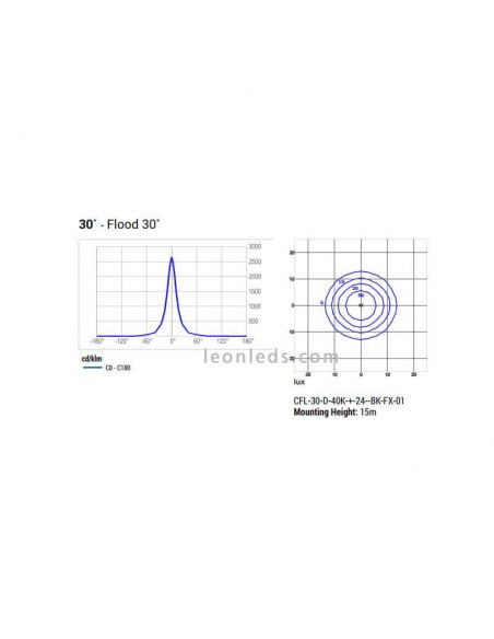 2.- Flood 30º : Deux fois le faisceau de lumière que celui de 15º, un angle de faisceau de lumière focalisé très utile dans une infinité d'illuminations, en anglais Flood qui traduit en espagnol signifie inondation de lumière.