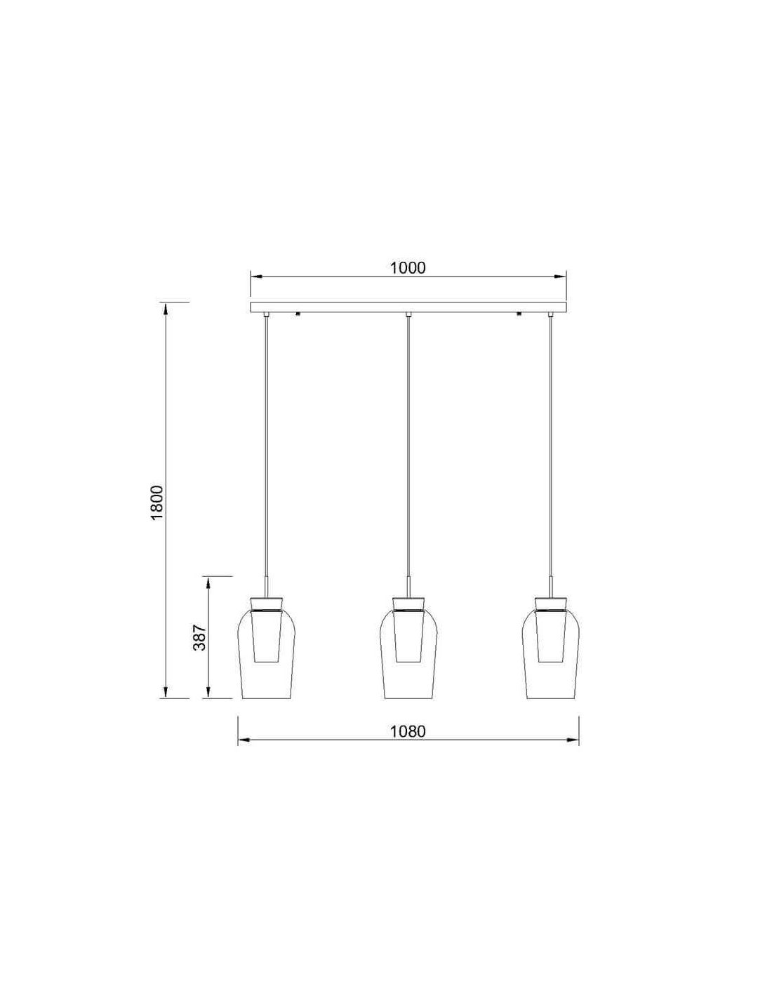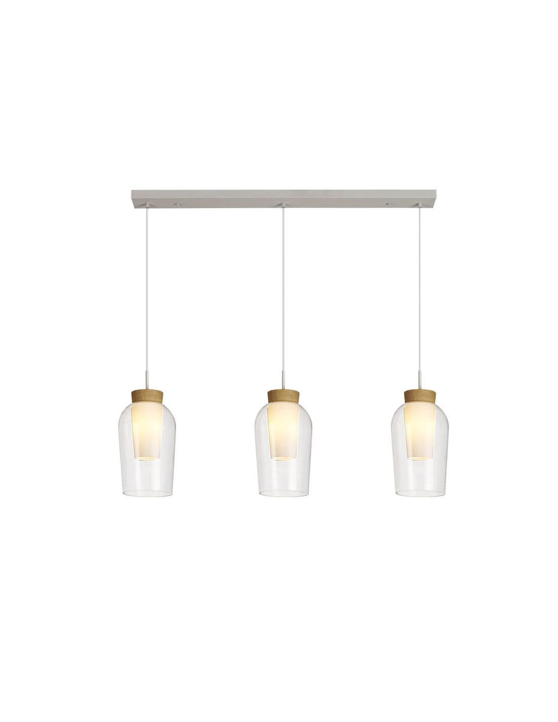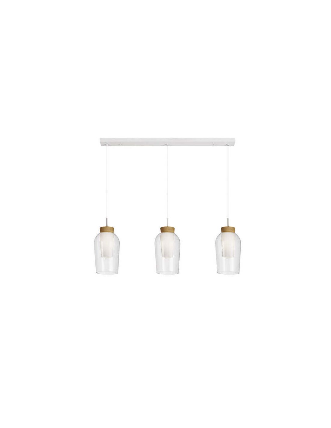 La suspension Nora 3L est composée de deux diffuseurs en verre (un mat et un transparent), qui s'appuient sur une base en bois dans une finition naturelle très cosy, contemporaine et fraîche pour la décoration intérieure. Il a des dimensions de 108 cm de long, 18 cm de large et 38,7 cm de haut. La hauteur d'installation maximale réglable est de 230 cm.