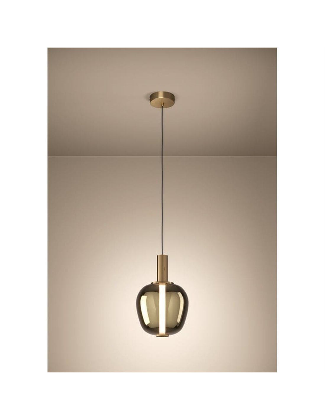 La suspension décorative LED FRUITERA apporte une touche haut de gamme grâce à son laiton brossé et son verre vaporisé doré . Son système de commande gestuelle sans contact permet une gestion aisée de la lumière, avec un contrôle réglable de la température de couleur et de l'intensité pour créer des environnements personnalisés. Dimensions : H 1500 mm · Ø 250 mm.
