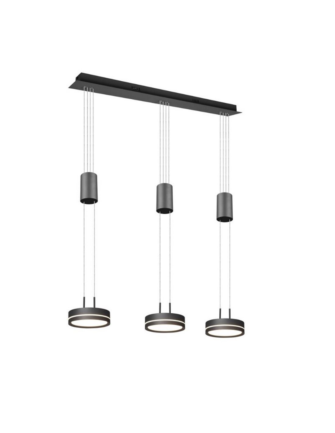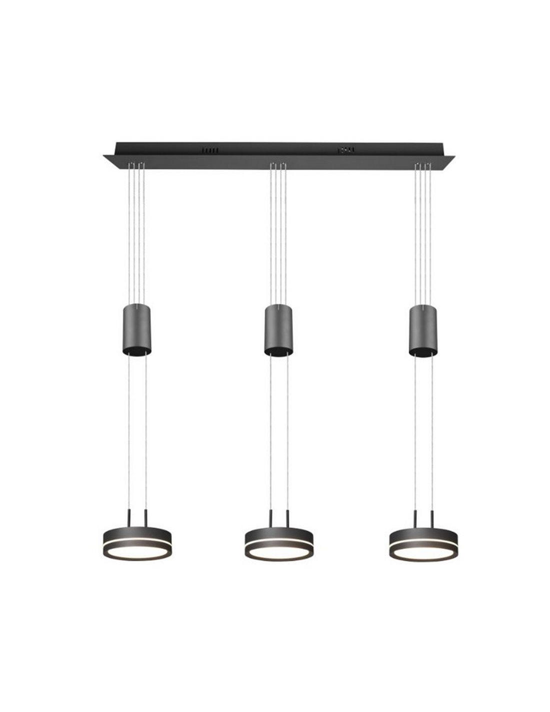 Le corps en aluminium anthracite allie robustesse et style contemporain. Les trois suspensions créent un effet visuel harmonieux, idéal pour éclairer les longues tables ou les îlots de cuisine. Son cadre de 85 x 14 cm et sa hauteur réglable ( 95-150 cm) permettent une installation personnalisée en fonction de l'espace.