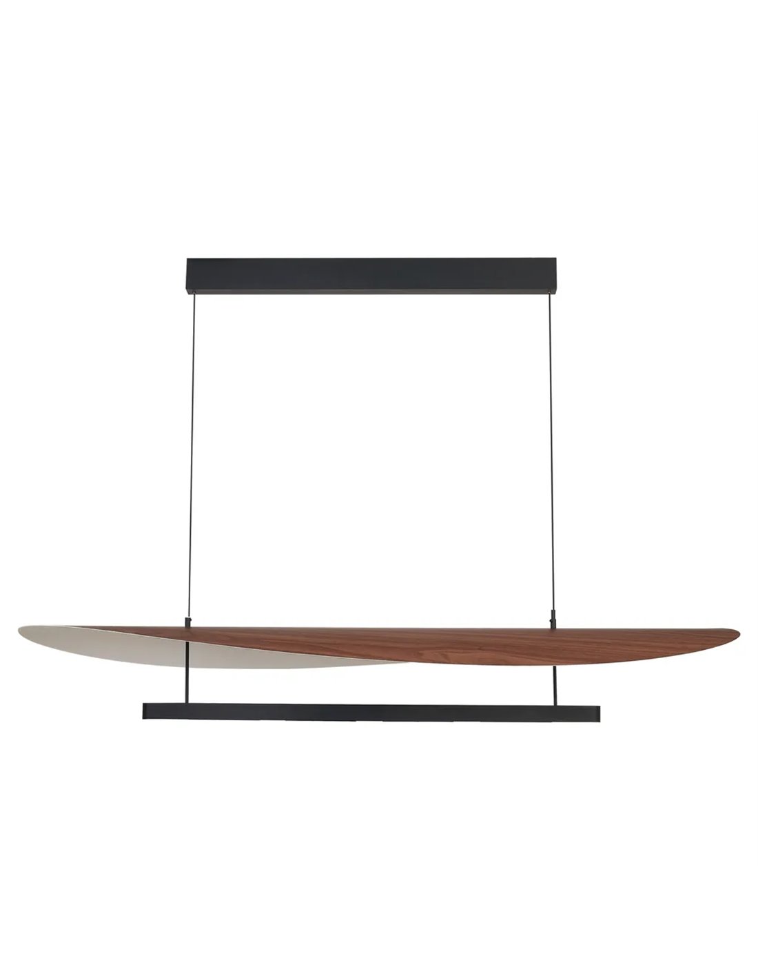Le contraste entre la finition noire du corps linéaire et la surface en bois du diffuseur crée une esthétique contemporaine très recherchée en design d'intérieur. Sa forme incurvée lui confère du dynamisme et en fait une pièce remarquable.
