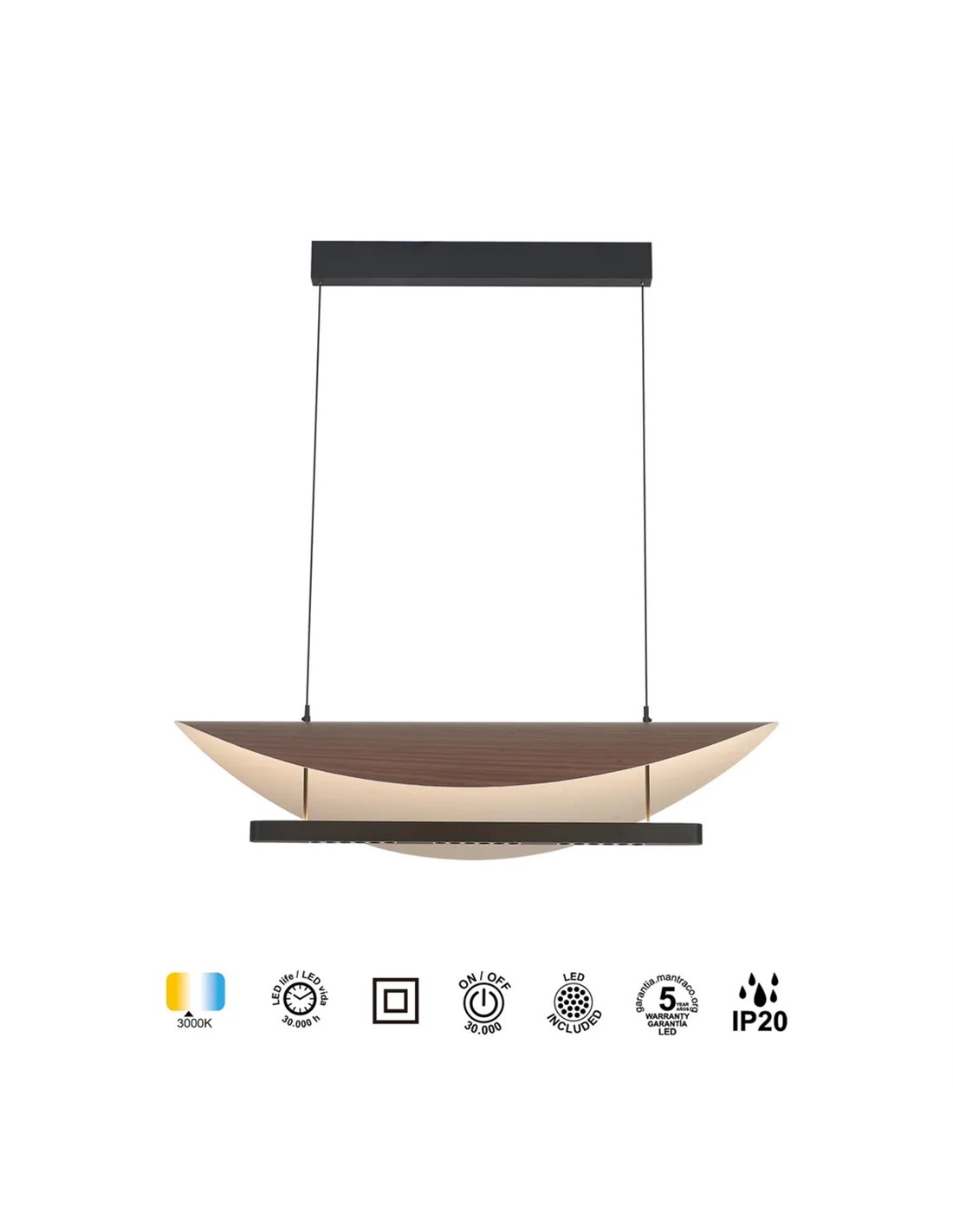 La suspension LED Abisal 40W se distingue par son design élégant et contemporain, alliant une structure noire à un diffuseur incurvé à l'aspect bois. Cette fusion de matériaux en fait un choix idéal pour les projets d'aménagement intérieur recherchant un équilibre entre modernité et chaleur.