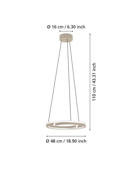 La suspension LED Eglo MEZZOMONTE présente un design circulaire élégant de couleur sable , suspendue par de fins câbles à un pavillon assorti. Elle intègre une LED de 40 W offrant un flux lumineux de 3 200 lumens et une fonction de température de couleur réglable (CCT Tunable White) permettant d'ajuster la température de couleur entre 2 700 K et 6 500 K. L'intensité lumineuse est dimmable grâce à la télécommande fournie .