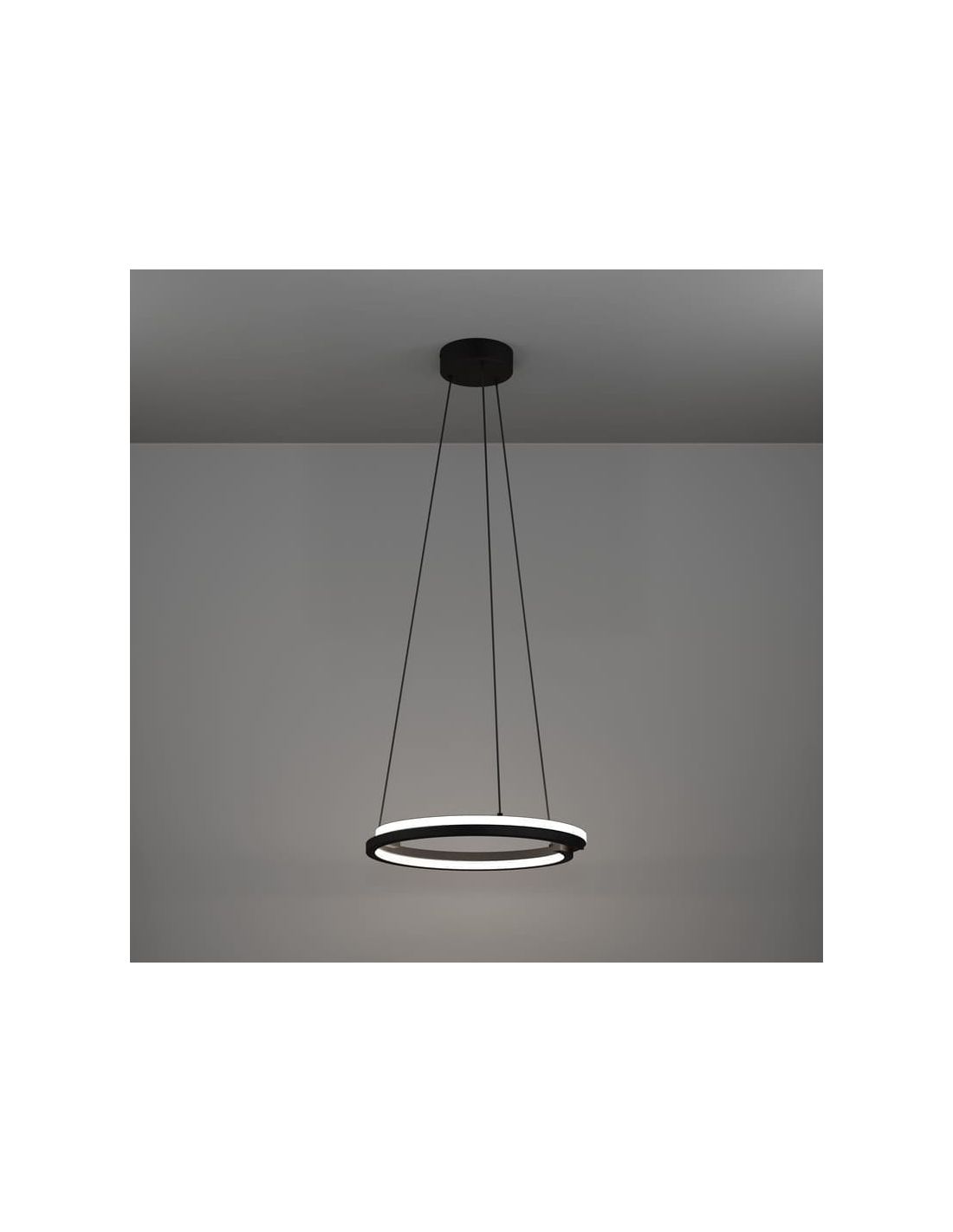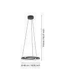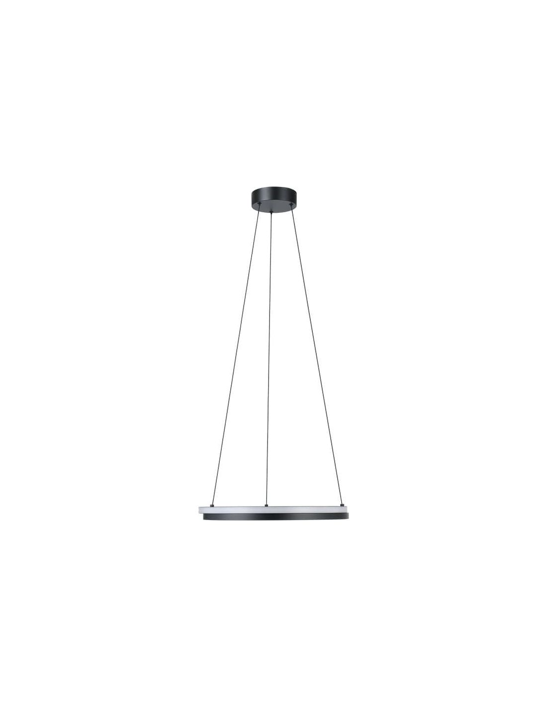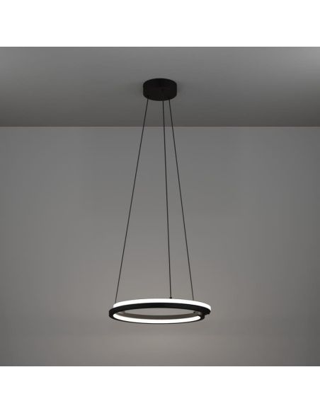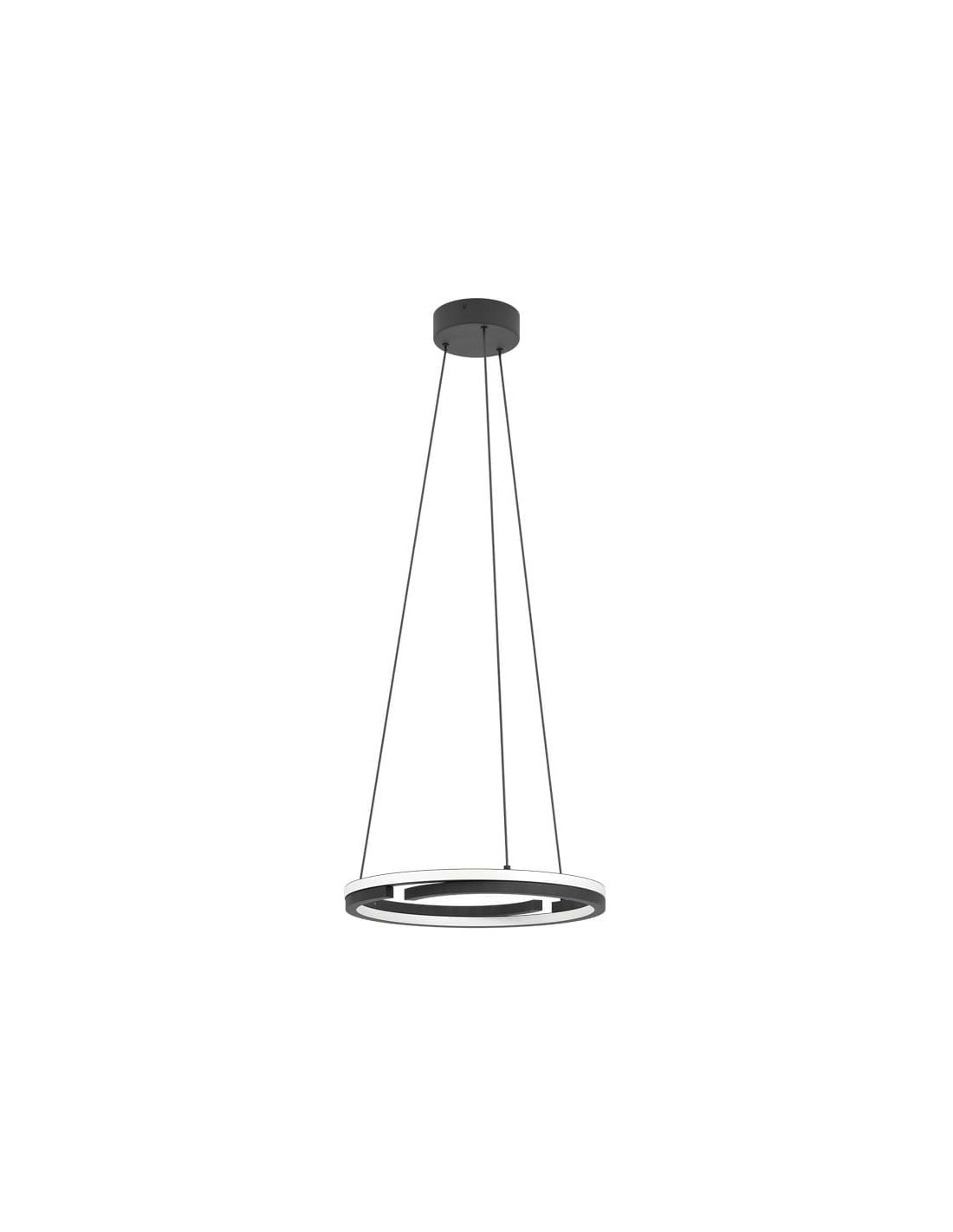 Suspension LED Eglo MEZZOMONTE au design minimaliste, composée d'un double anneau plat suspendu par quatre câbles à un pavillon noir. Elle intègre une LED de 20 W offrant un flux lumineux de 2 220 lumens et une fonction de température de couleur réglable (CCT Tunable White) permettant d'ajuster la température de couleur entre 2 700 K et 6 500 K. L'intensité lumineuse est dimmable grâce à la télécommande fournie .